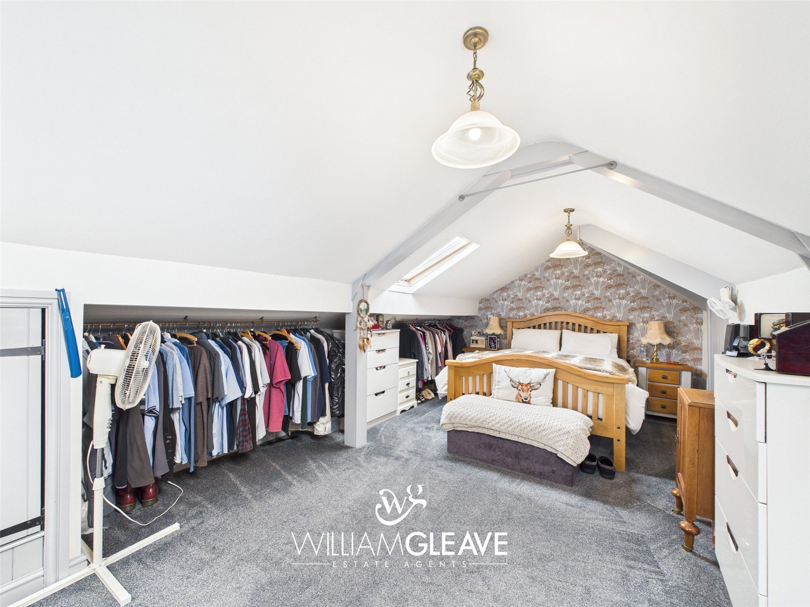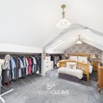 Stairs lead up from the owners living room to bedroom area. With velux windows, eaves storage cupboards, carpet, TV point and power points.