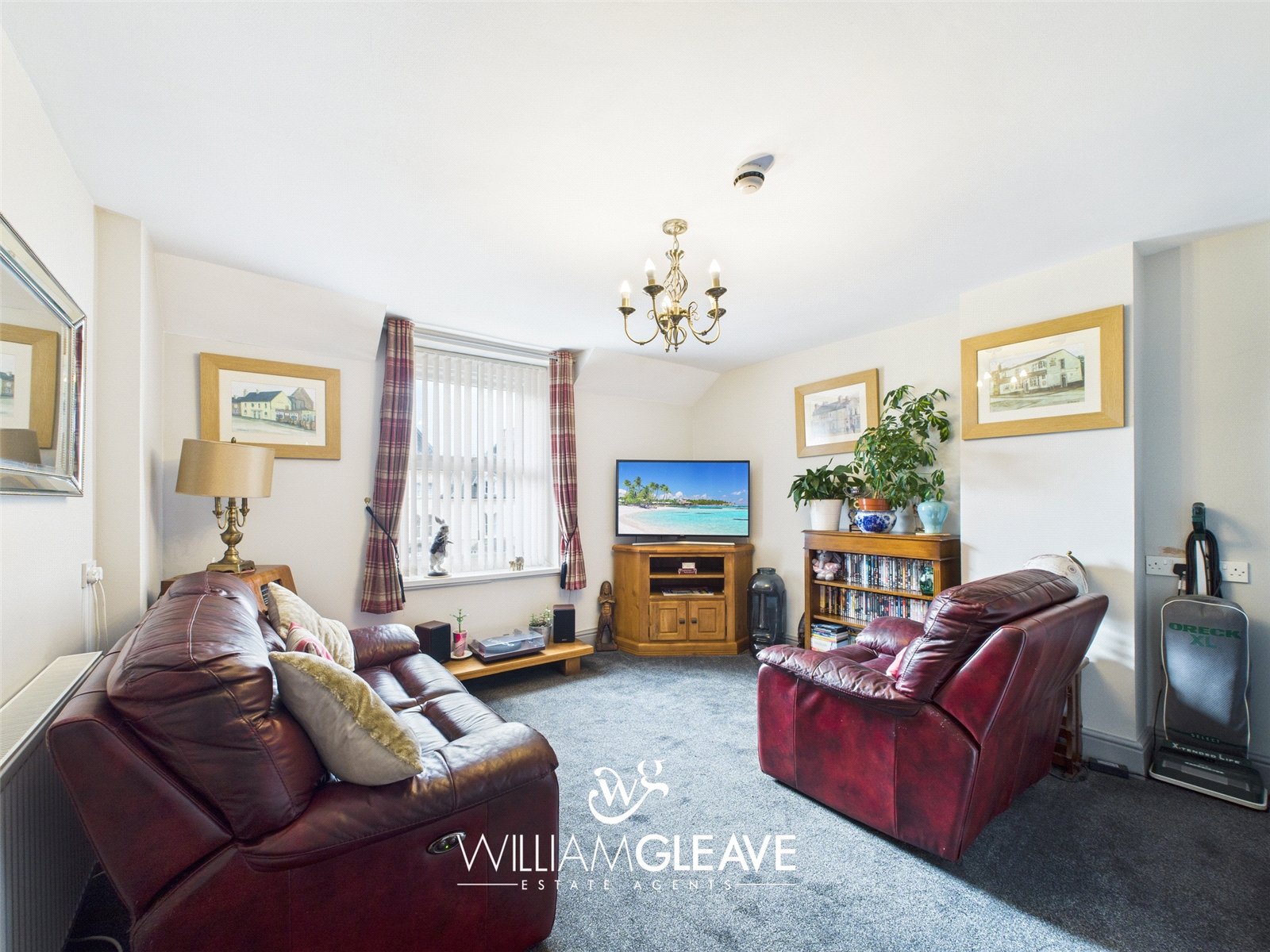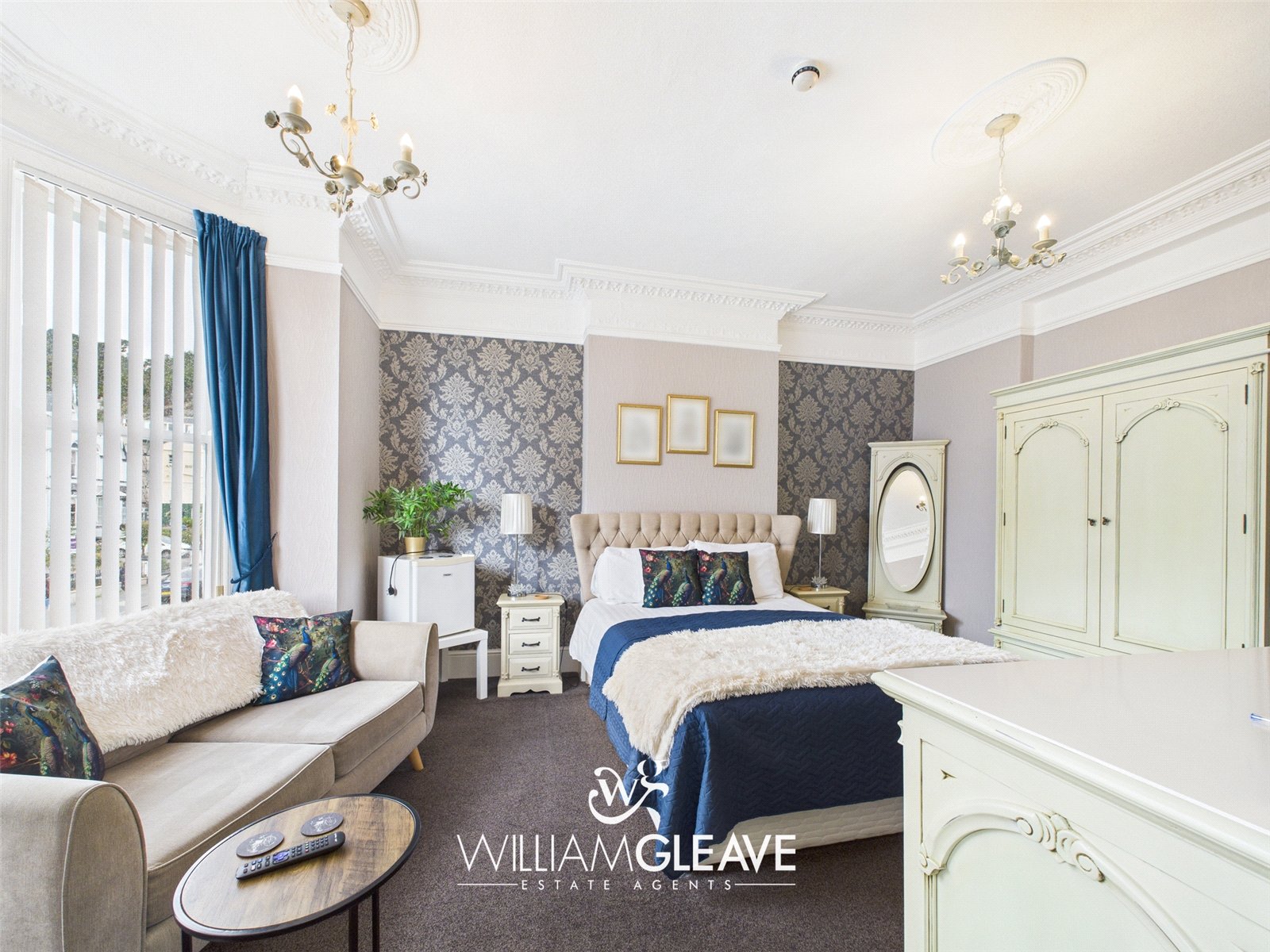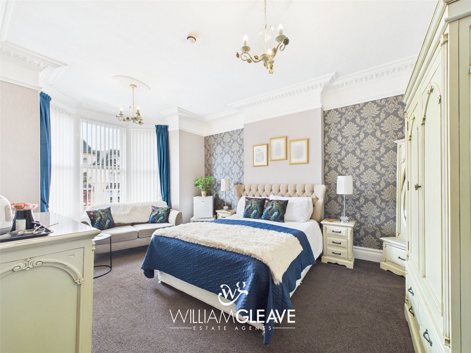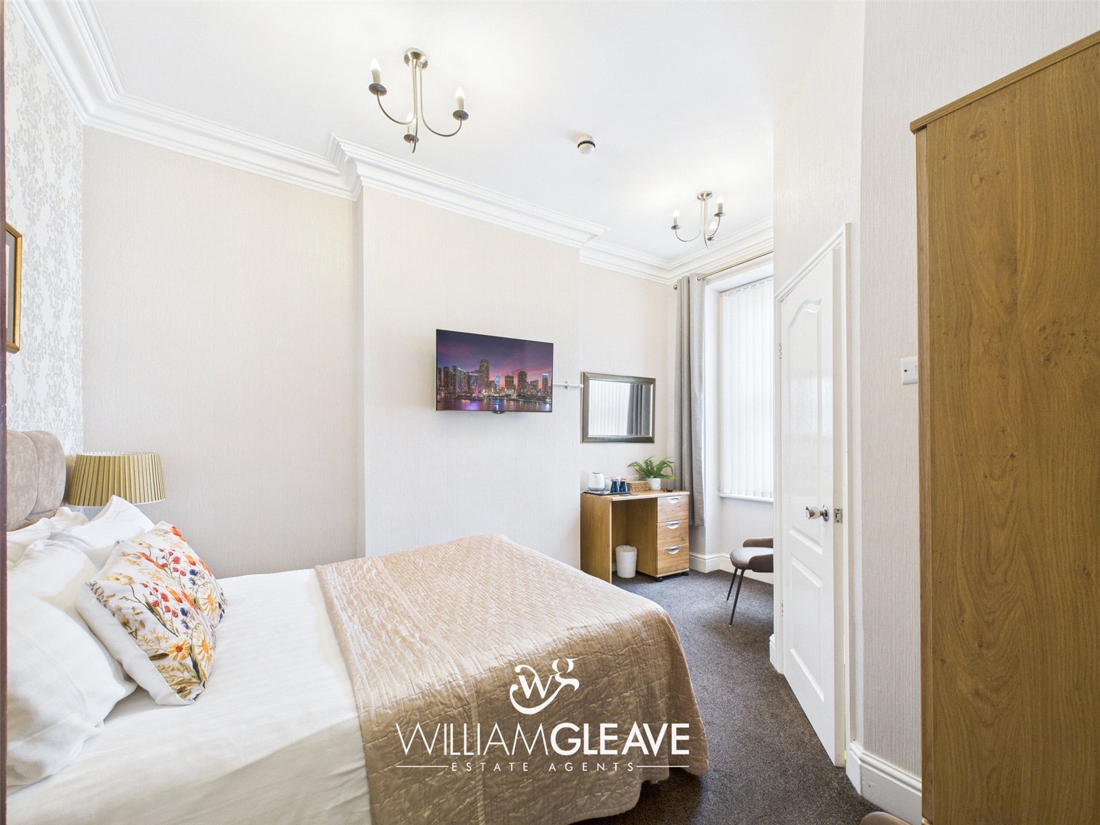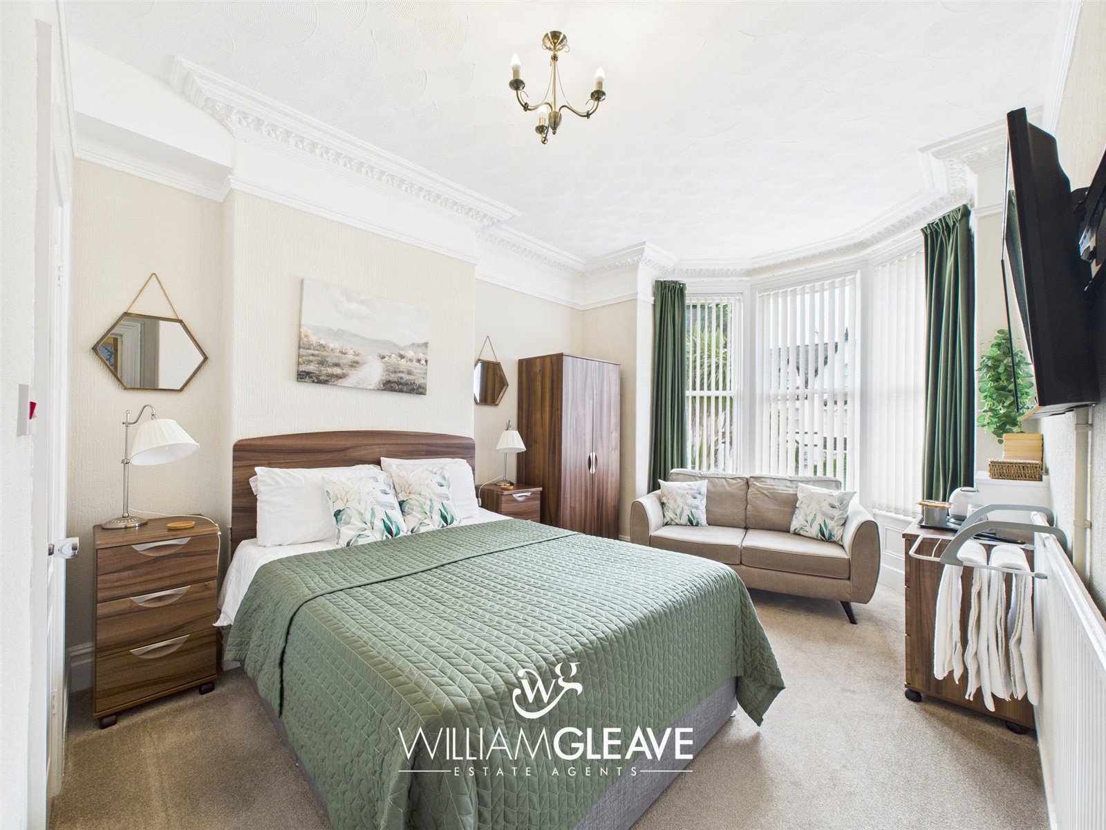 With bay window to the front, ornate coved ceiling, carpet, TV point and power points.