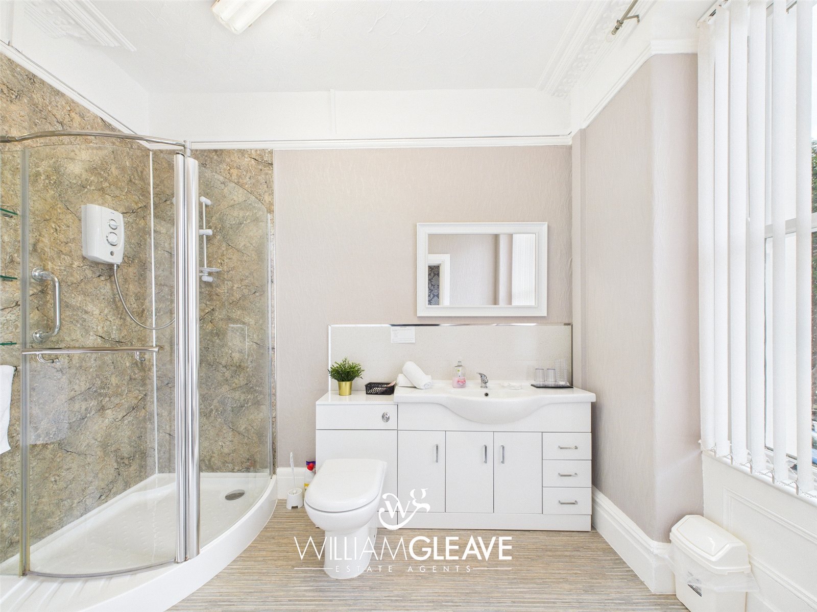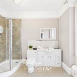 With double shower cubicle, low level WC and was hand basin with vanity cupboard beneath.