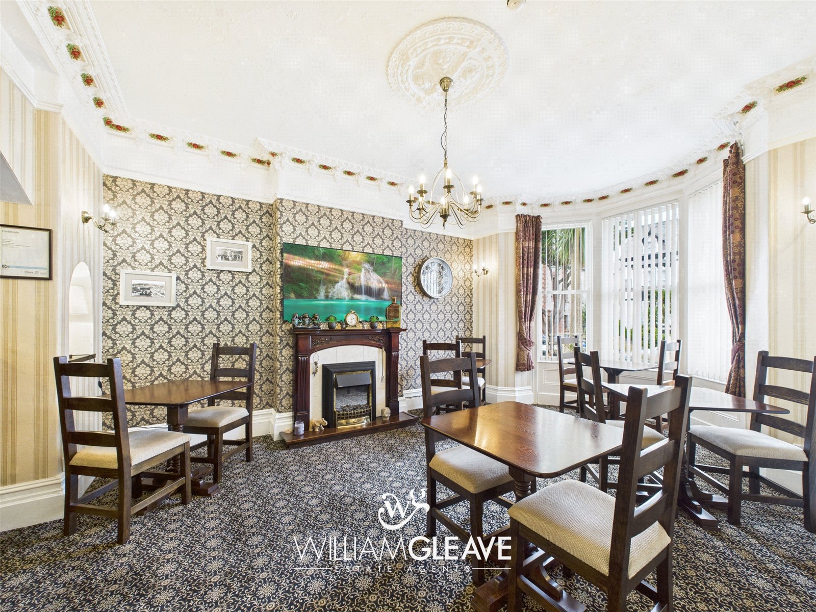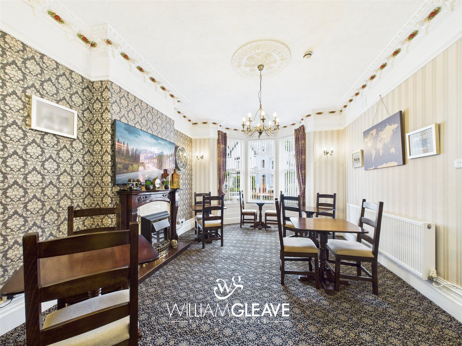 With bay window, ornate coved ceiling, carpet, TV point, radiator and power points.