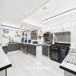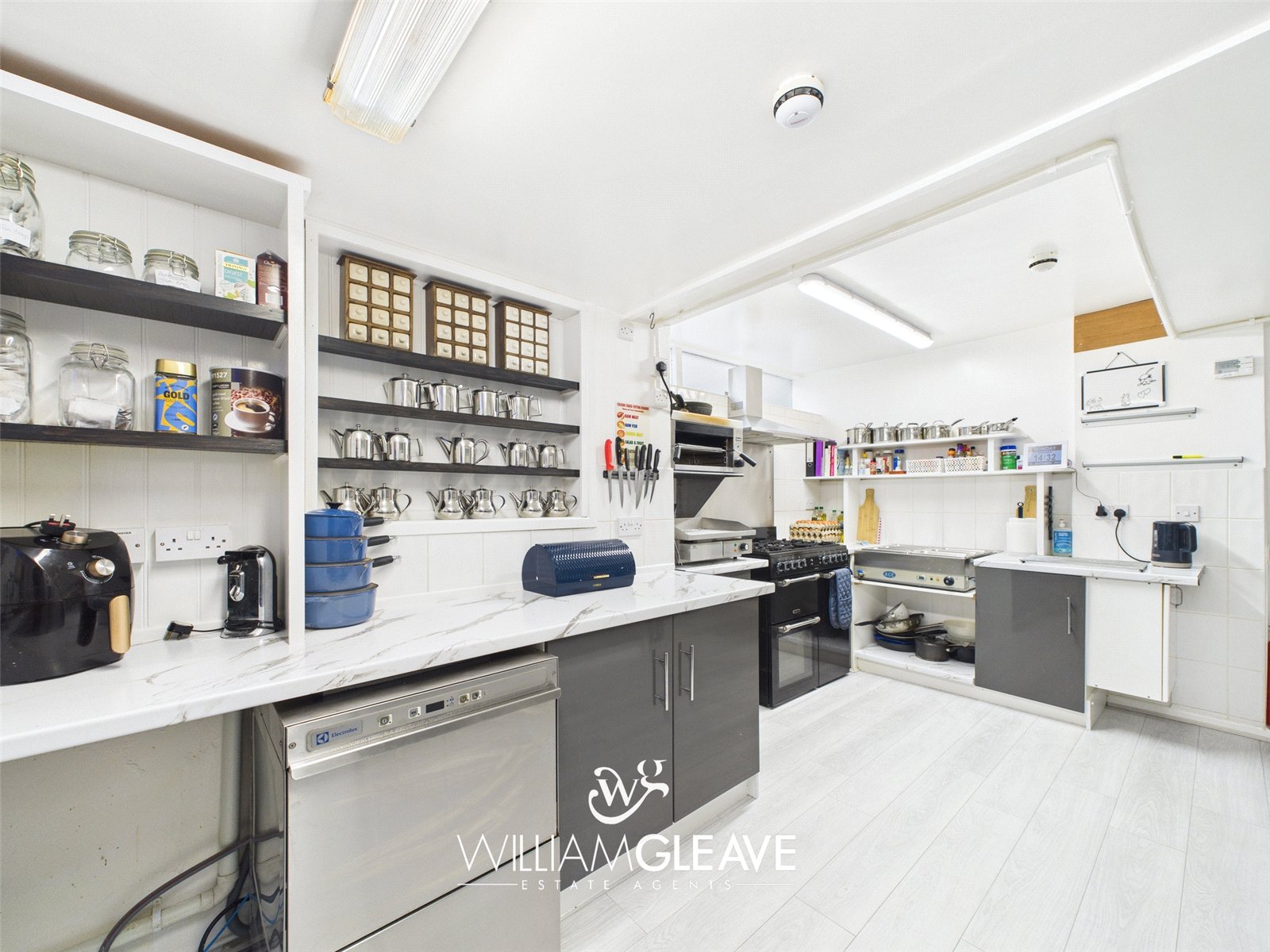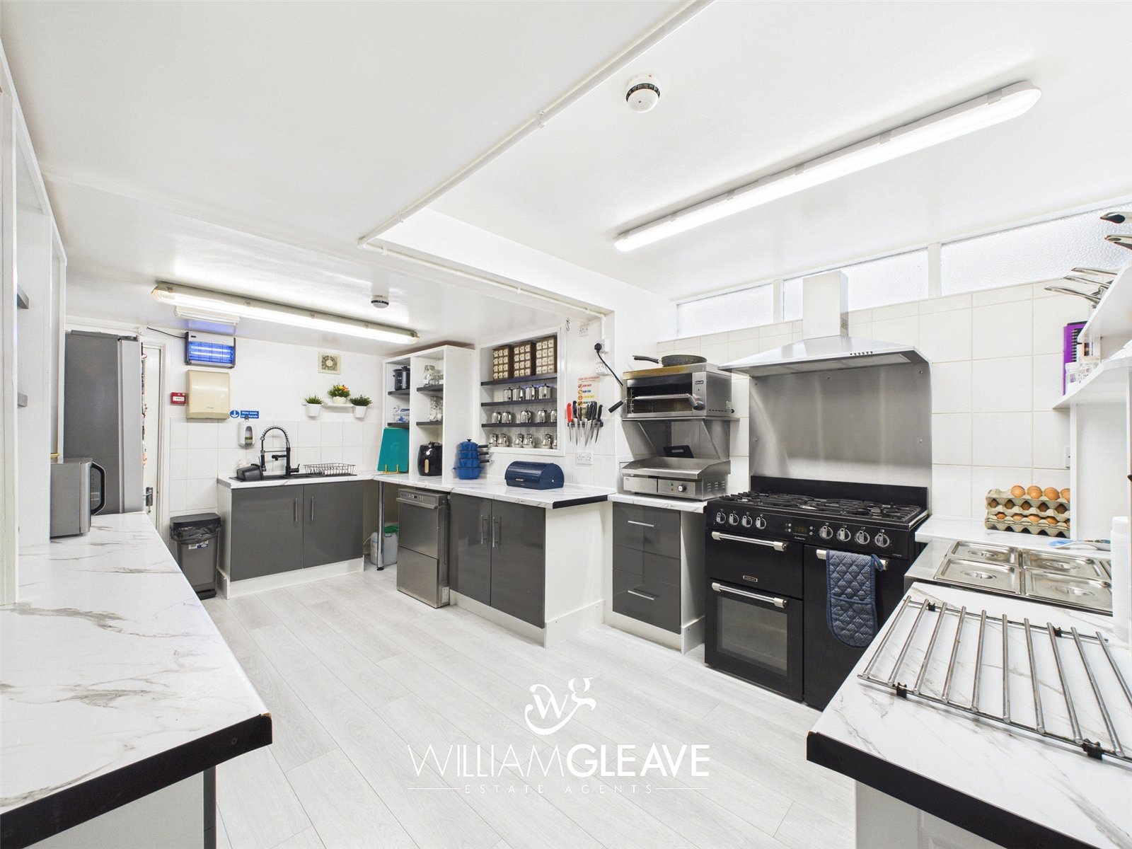 The kitchen is fully equipped and ready for operation, including a high capacity range cooker, integrated dishwasher, bain-marie for hot food service, stainless steel sink unit, refrigerator, laminate flooring, and conveniently located electrical power points for additional appliances.