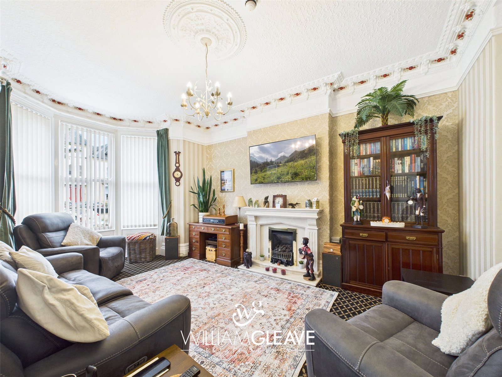 With bay window to the front, feature fireplace, ornate coved ceiling, carpet, TV point, radiator and power points.