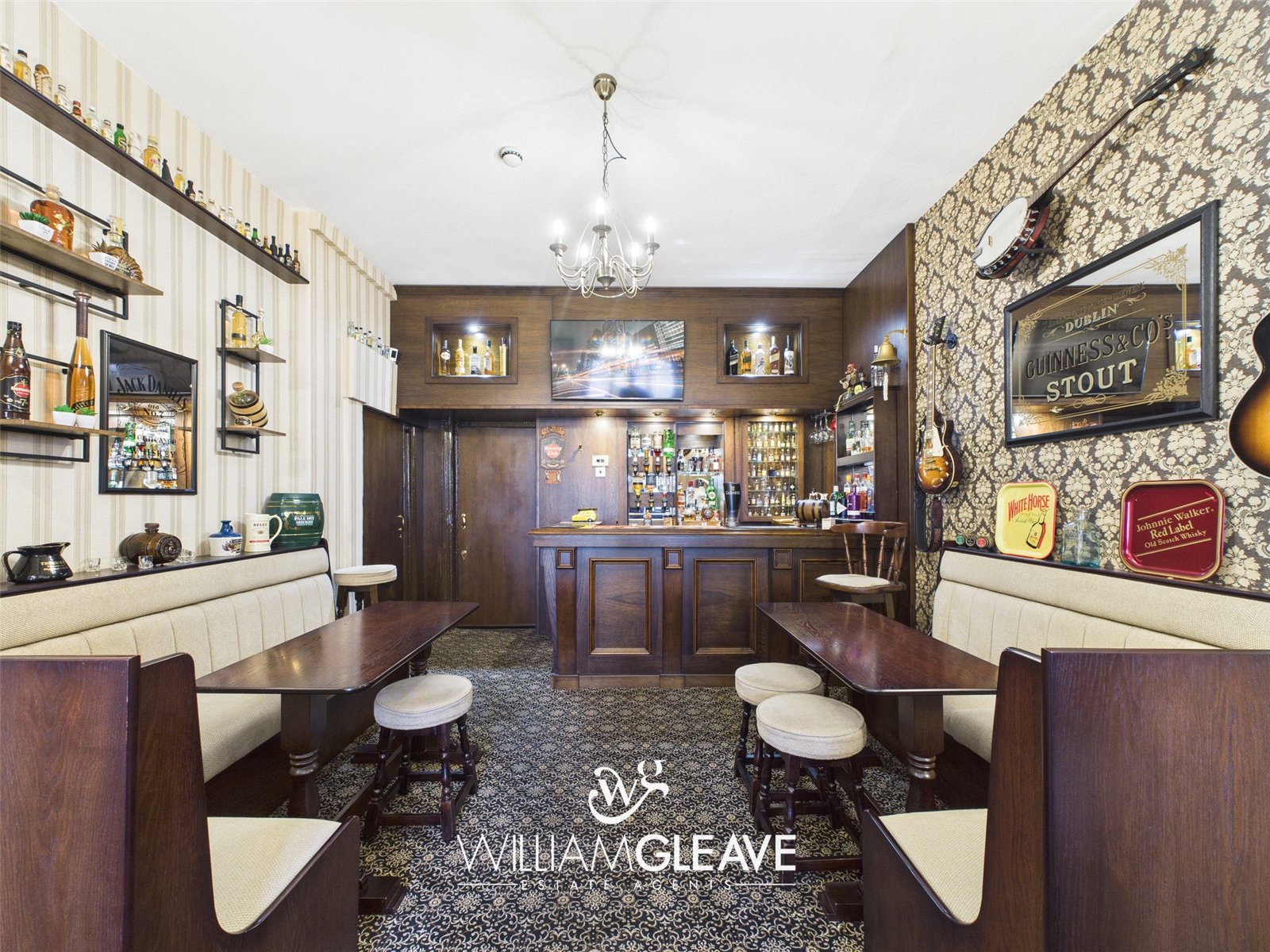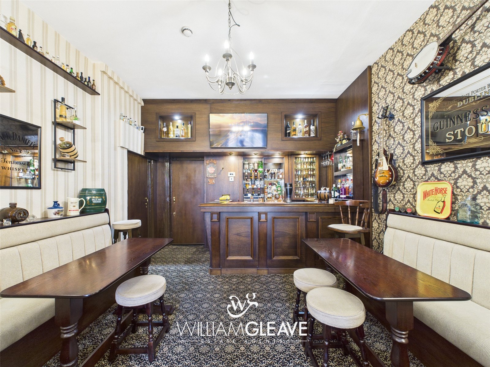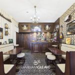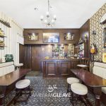 Custom built bar area includes luxurious upholstered booth seating with coordinating tables, creating an intimate and stylish space. The fully stocked bar is equipped with premium shelving, glassware, and ample storage for spirits and mixers ideal for entertaining guests.