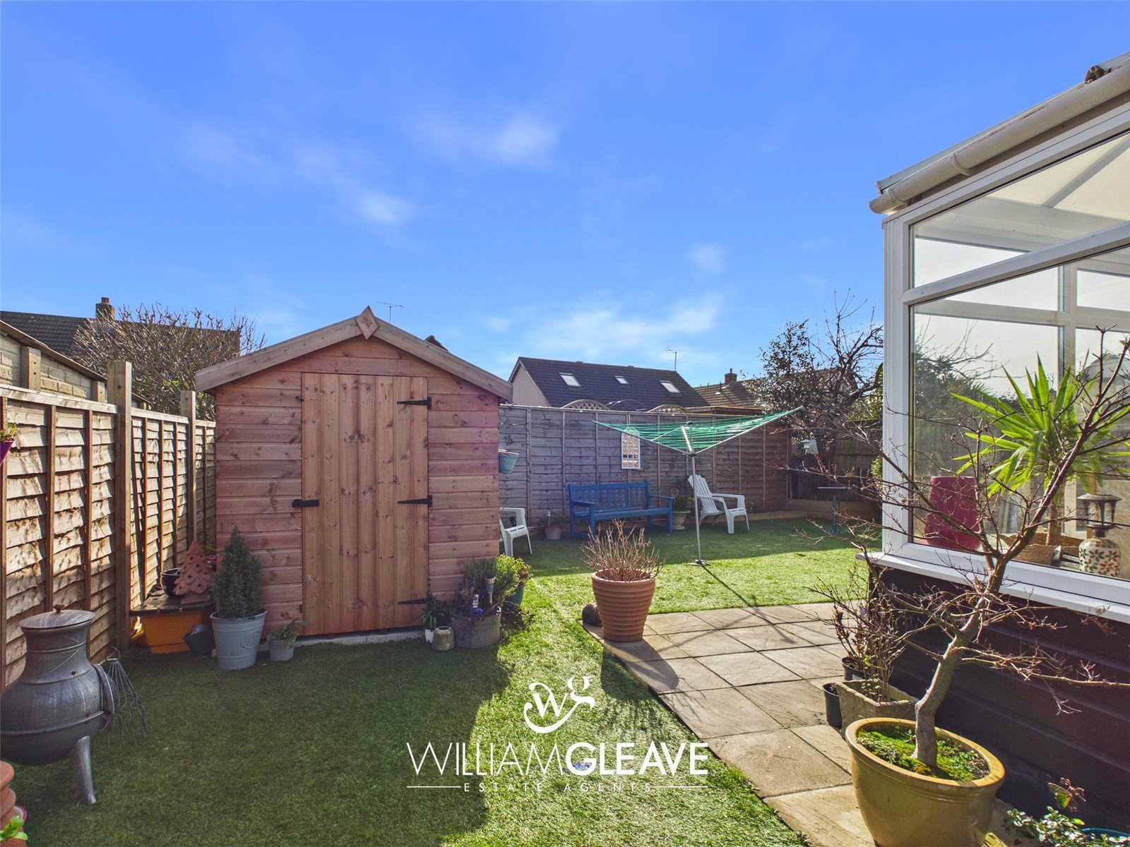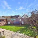 The rear garden is a generous and versatile space, partially paved with an artificial grass area to the rear, enclosed by fence panels offering privacy. To the side, near the double doors accessing the sunroom, there is a decked area currently used as a seating space, perfect for relaxing or entertaining.