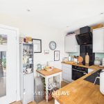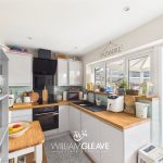 The kitchen is a good-sized space featuring wooden laminate flooring and neutral painted walls, with a modern tiled splashback along the rear wall. It is fitted with a range of pale grey gloss wall and base units complemented by wooden worktops, offering ample storage and preparation space. The kitchen also includes a stylish black sink with black steel fittings, an integrated hob and oven, and space for additional appliances. A double-glazed window provides a view into the conservatory, and the kitchen is open plan to the conservatory, creating a bright and sociable layout. The room also benefits from multiple power points and a radiator for heating.
