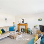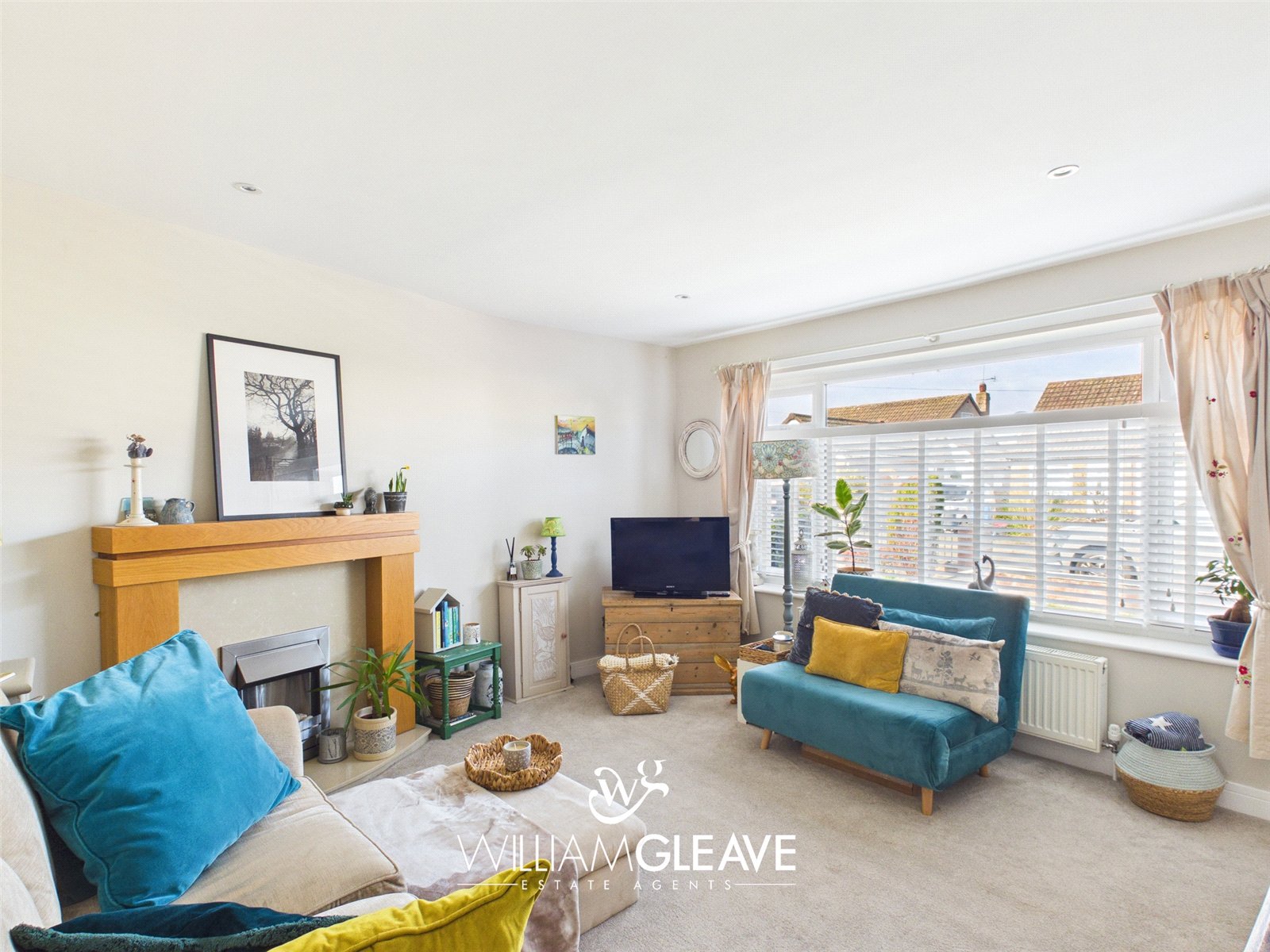 The living room is entered through a modern white door and is a spacious, well-presented room. It features a large, double-glazed window to the front elevation with views over the front of the property, allowing plenty of natural light into the space. The room has neutral painted walls and carpeted flooring, with ample space for furniture. A marble fireplace provides an attractive focal point, and the room also benefits from TV points, multiple power points, and a radiator for heating. From the living area, there is access to a further hallway which leads to the remaining rooms of the property.