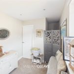 The modern shower room is entered through a modern white door and features a stylish, contemporary finish. It includes a whitewash basin, WC, and a shower with a glass panel, all complemented by stainless steel fittings. The walls are finished with beige shower tiling, and a double-glazed frosted window to the rear elevation allows natural light while maintaining privacy. The room also benefits from a stainless-steel heated towel rail.