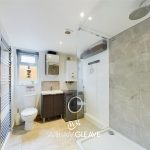 A stylish shower room comprising of a walk in shower with rainfall shower head, low flush wc and wash hand basin set with a vanity unit. Chrome ladder style radiator, frosted window to the rear, partly tiled walls, tiled flooring, wall mounted combi boiler and plumbing for washing machine.