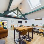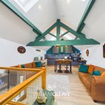 Open plan living with a kitchen to the rear comprising of wall, base and drawer units with complementary worktop surface over, inset sink with mixer tap and a grey tiled splashback. There are some integrated appliances to include; a four ring gas hob, extractor hood, oven, grill and fridge. The first floor is complete with wood effect flooring, there is a window to the front elevation and ceiling lights creating a light and airy space. Radiator, inset ceiling spotlights, television point, power points, feature beams, glass balustrades to top of staircase.