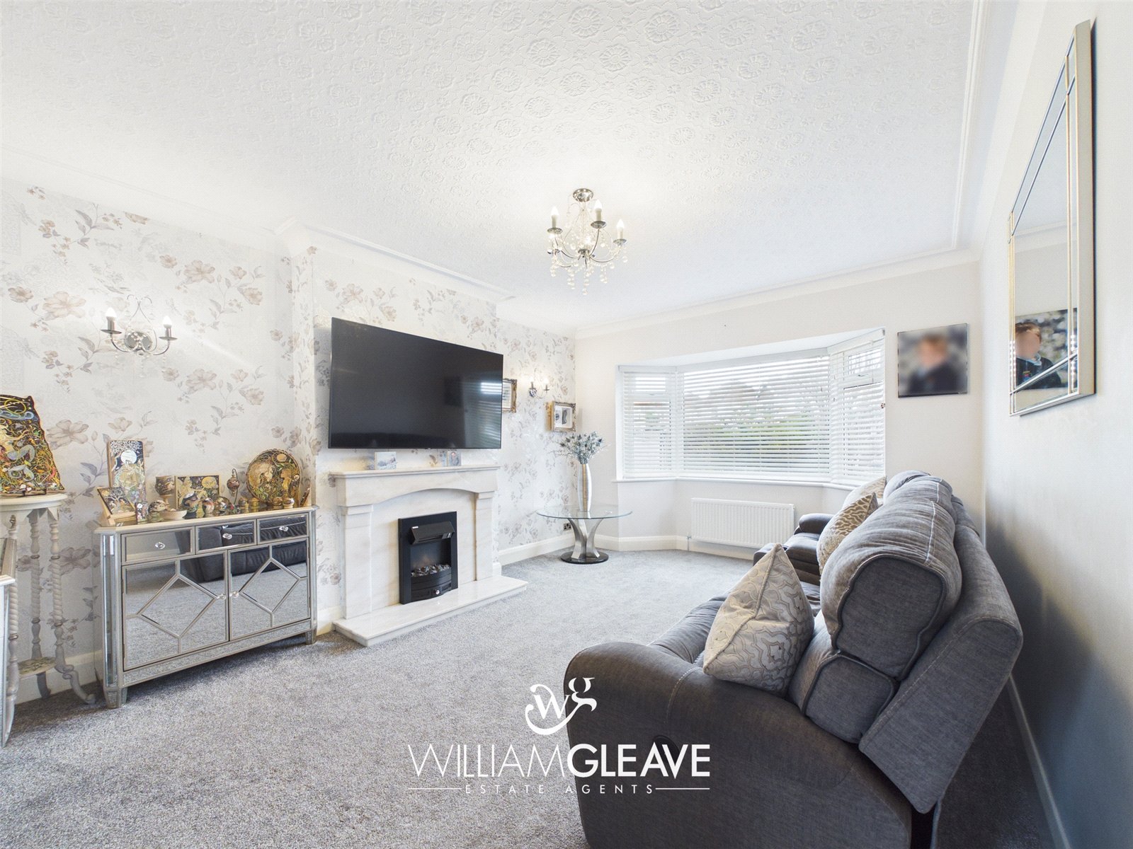 A spacious living room with a large bay window flooding the living space with natural light, feature white marble fireplace, carpet, radiator, TV point and power points.