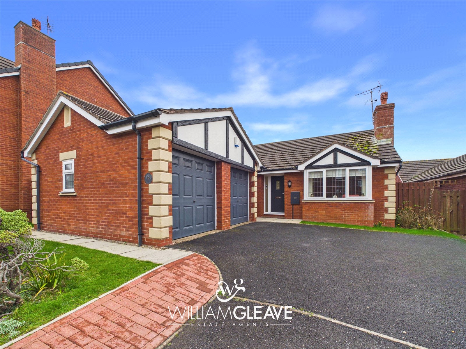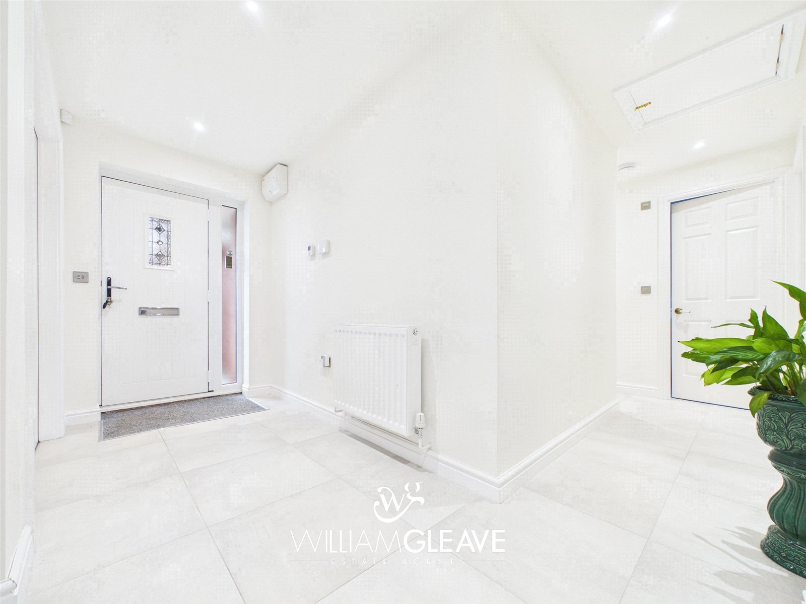 The front of the property offers a driveway with parking for multiple vehicles and access to the double garage, which benefits from full power and two electric doors. There is a low-maintenance front area laid with patio slabs and laid lawn.