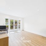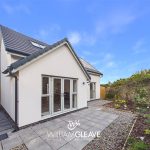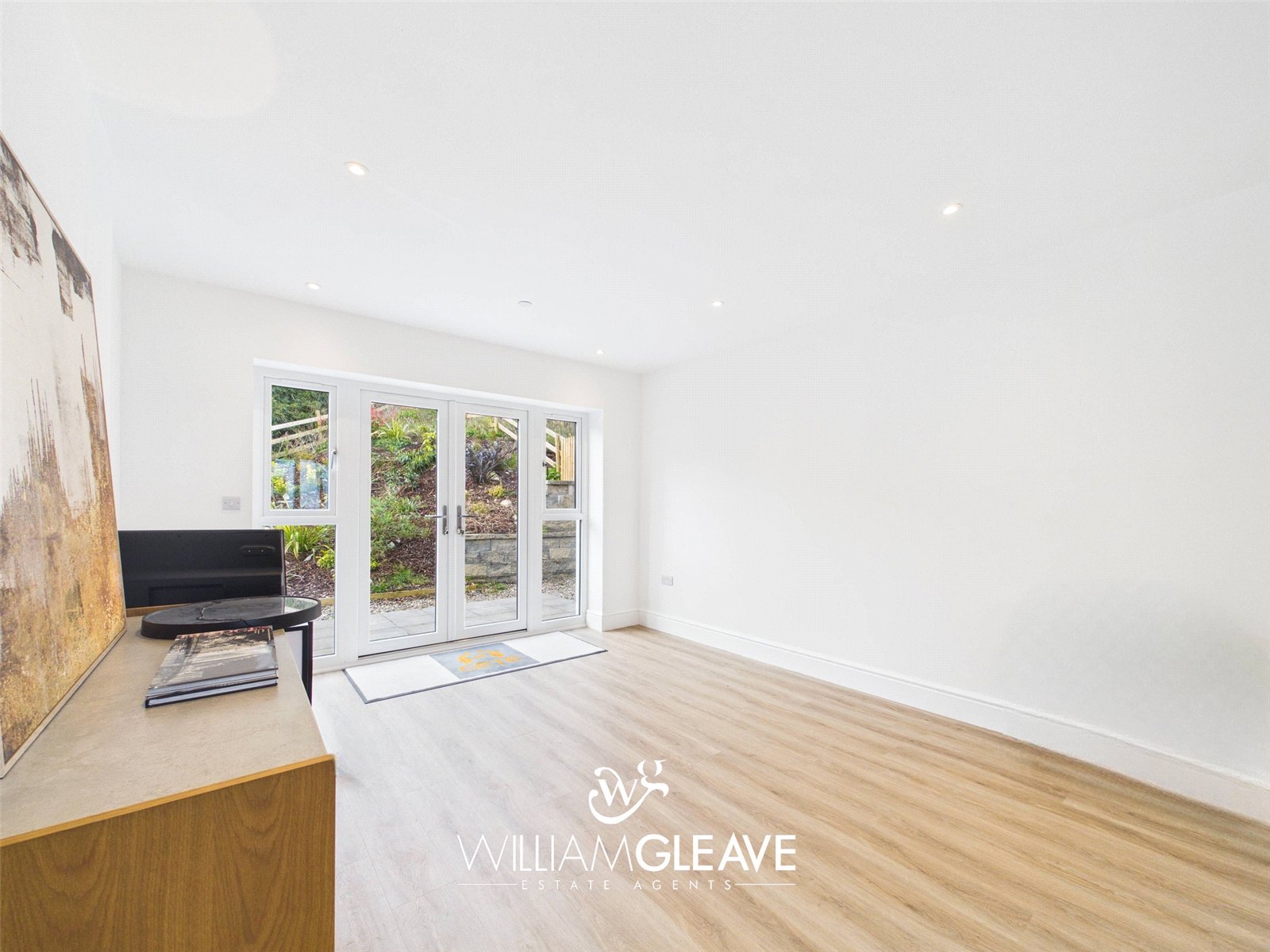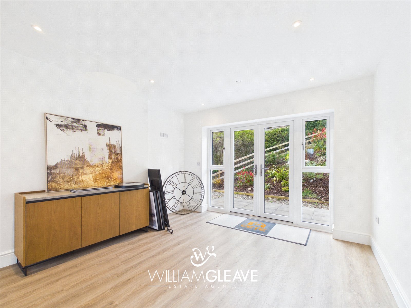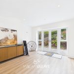 The open-plan living and dining area features triple-glazed patio doors with matching side panels that flood the space with natural light and open directly onto the rear garden. The room is finished with modern laminate flooring and benefits from underfloor heating, multiple power points, and a TV point, creating a comfortable and versatile space ideal for everyday living and entertaining.