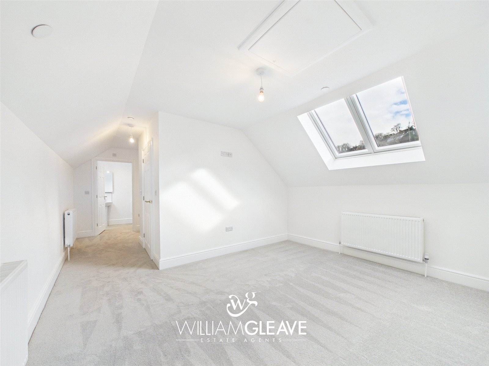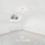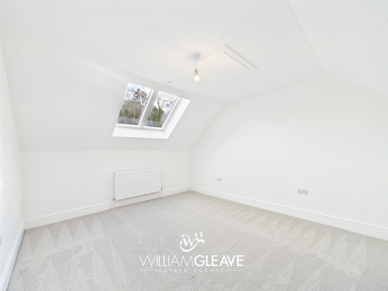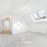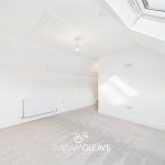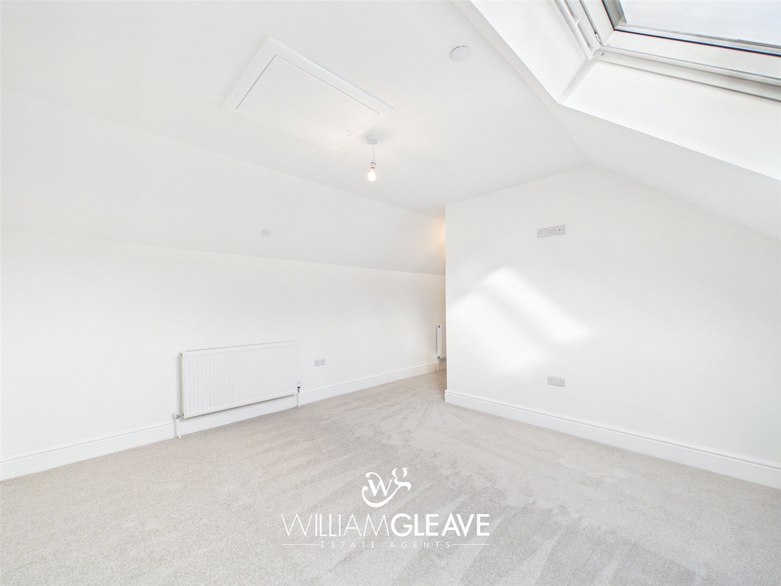 This generous double bedroom features two skylight windows that brighten the space and create an airy, welcoming atmosphere. The room includes a radiator, carpet flooring, a TV point, and multiple power points for convenience. With ample space for essential bedroom furnishings and a double bed, it offers a comfortable and versatile layout ideal for everyday living.