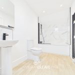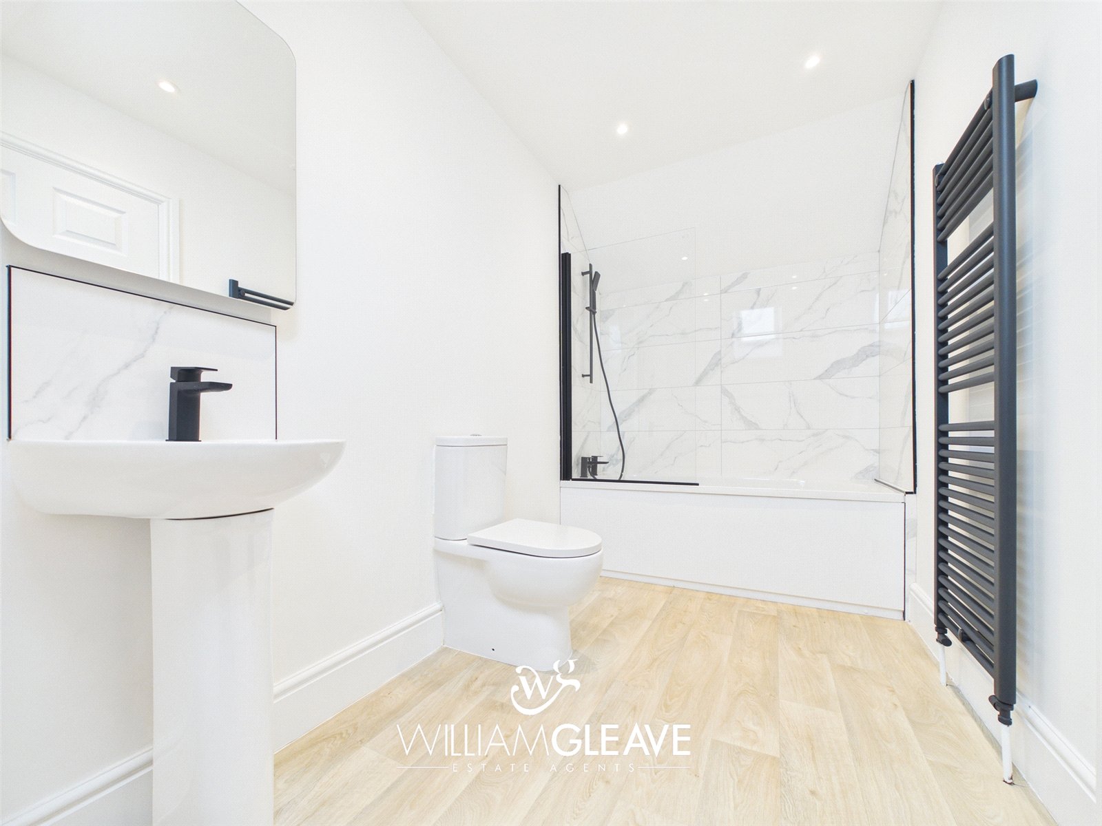 The bathroom is fitted with a low-level WC, a pedestal wash hand basin with mixer tap and tiled splashback, along with a panelled bath featuring a glass shower screen, mixer tap, and a mains-powered wall-mounted shower. The room is finished with LVT flooring, a heated towel rail, and a skylight.