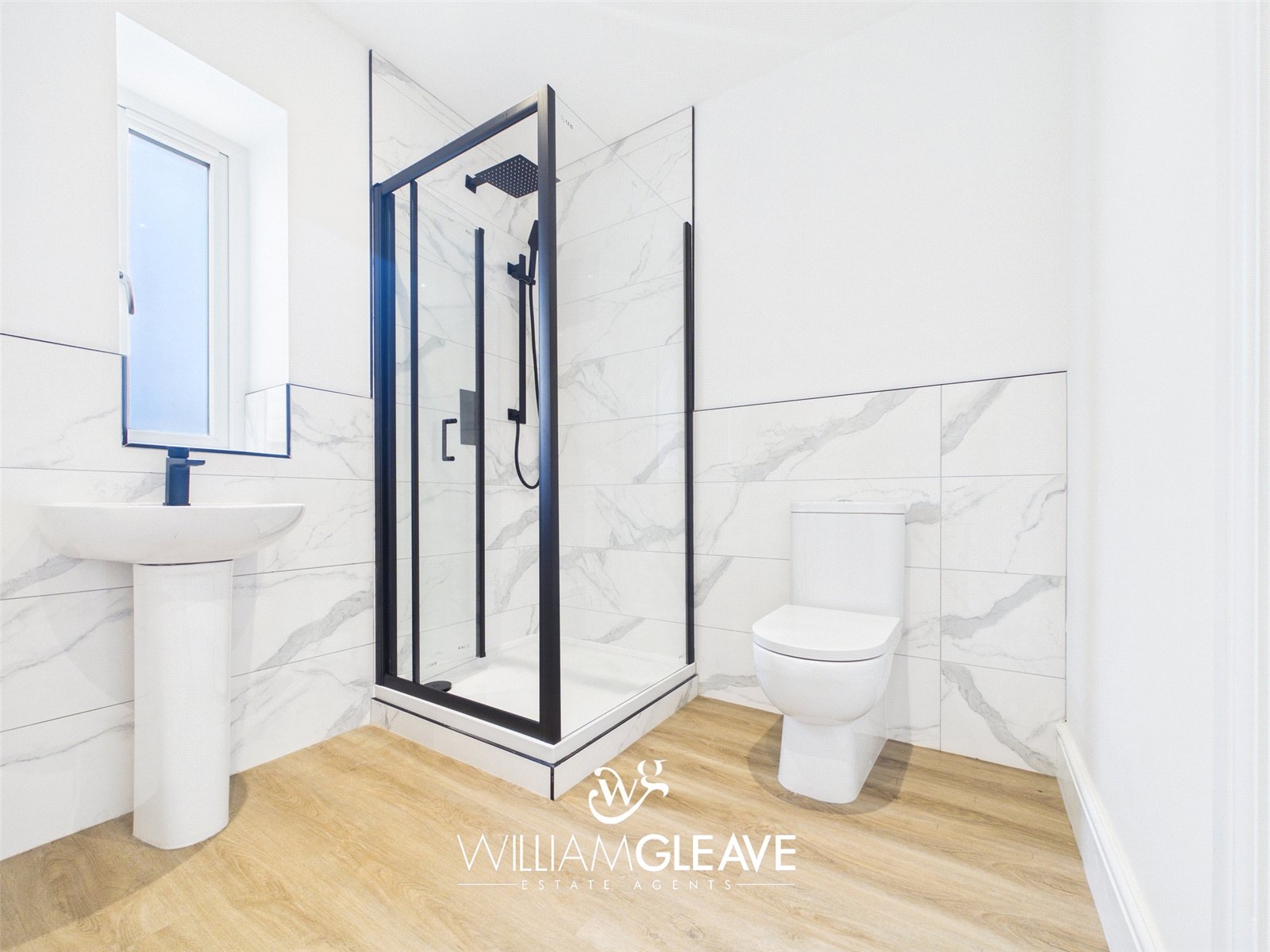 The downstairs shower room is fitted with a low-level WC, a pedestal wash hand basin with mixer tap, and a separate shower cubicle with a mains-powered shower. The space features partially tiled walls for easy maintenance and a frosted triple-glazed window providing natural light and privacy.