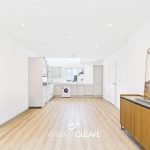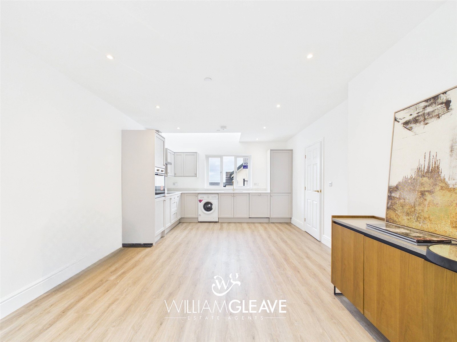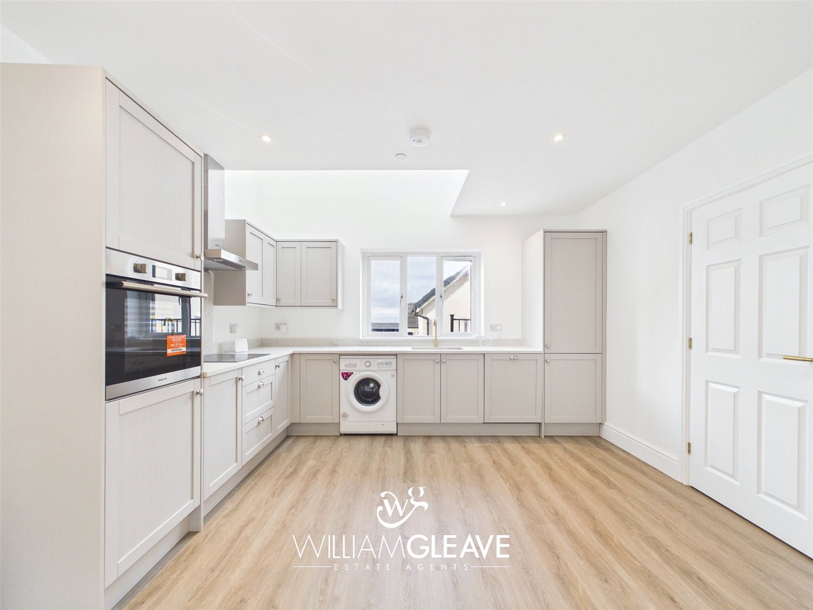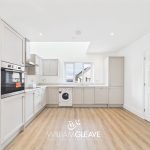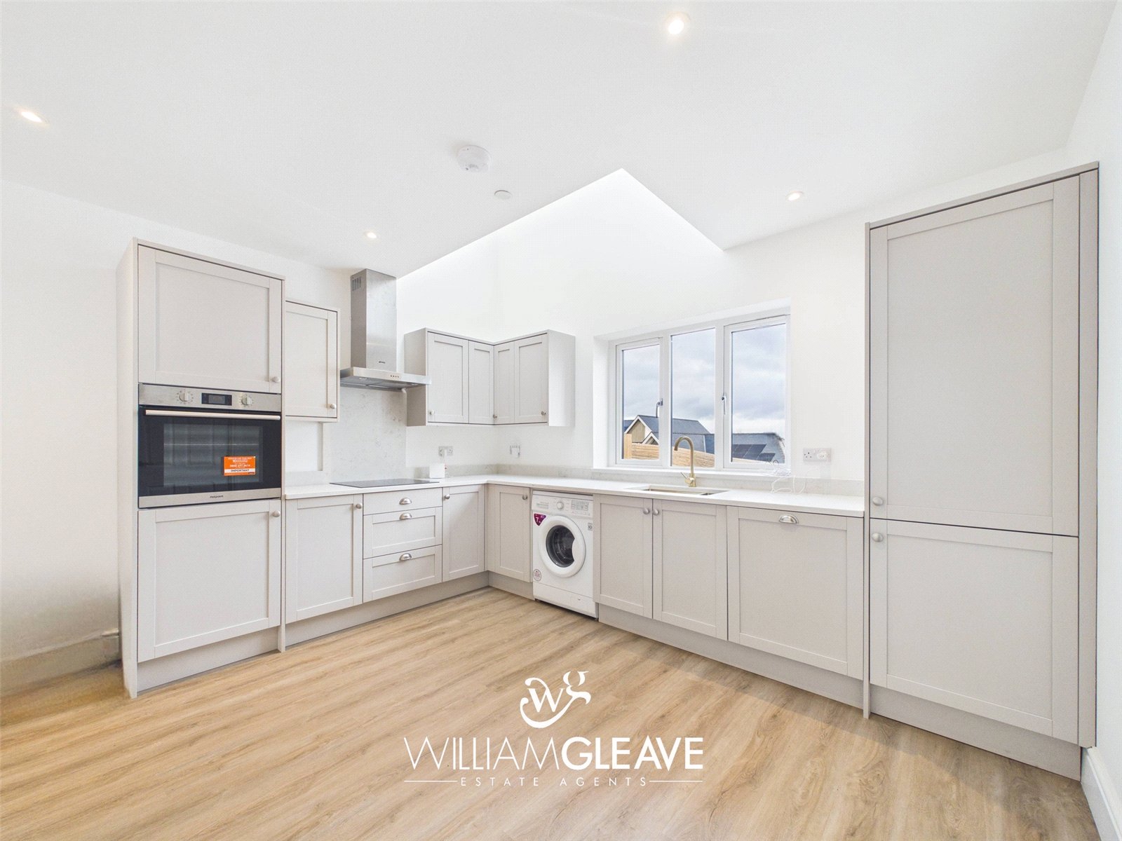 The kitchen area is fitted with a modern range of wall and base units, complemented by a matching quartz worktop. It includes an inset one-and-a-half sink with mixer tap and a selection of integrated appliances such as a fridge-freezer, dishwasher, induction hob with stainless steel extractor hood, and an electric oven, along with a fitted washing machine. The underfloor heating continues through this space, and a triple-glazed window to the front elevation provides plenty of natural light, with ample power points for convenience.