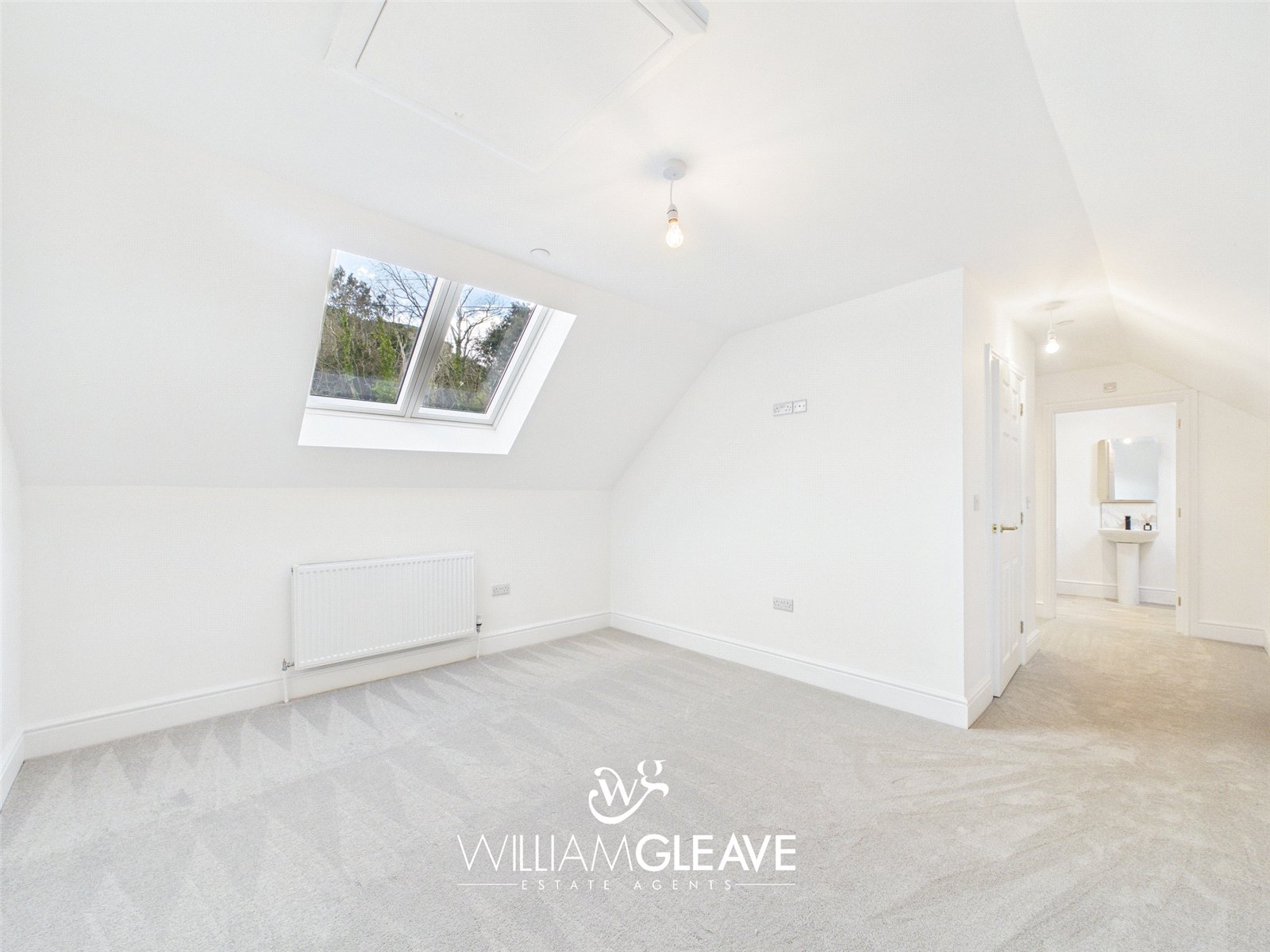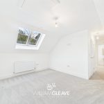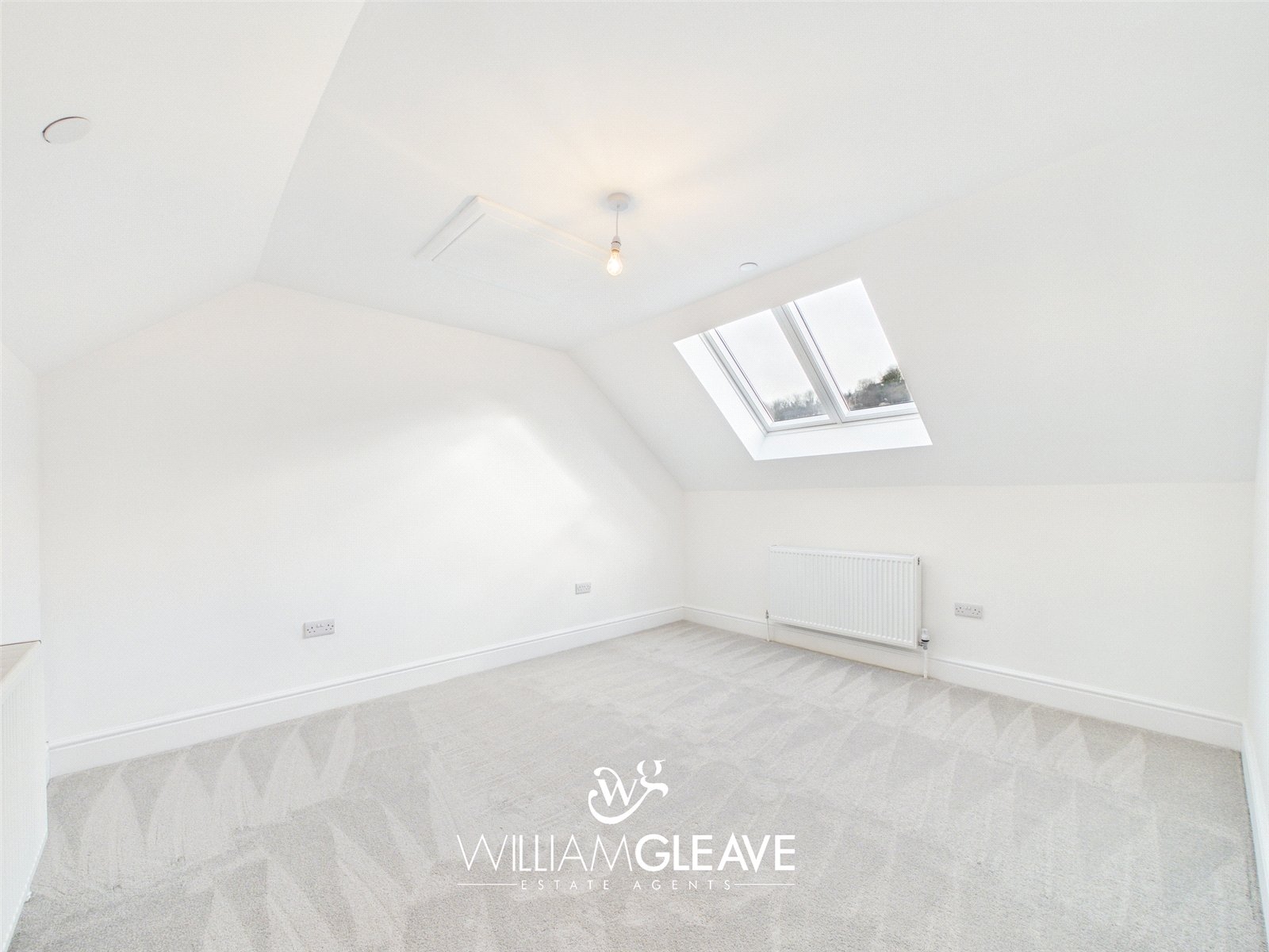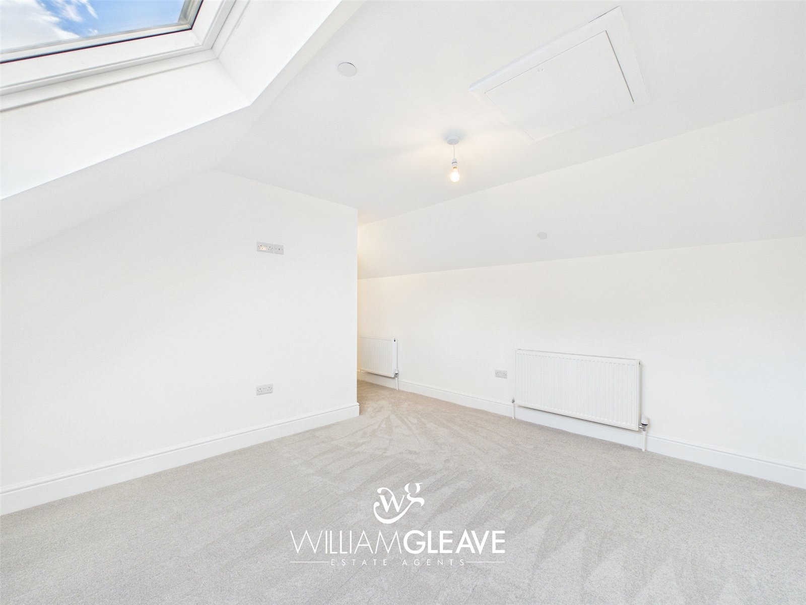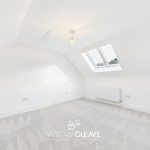This generous double bedroom features two skylight windows that brighten the space and create an airy, welcoming atmosphere. The room includes a radiator, carpet flooring, a TV point, and multiple power points for convenience. With ample space for essential bedroom furnishings and a double bed, it offers a comfortable and versatile layout ideal for everyday living.