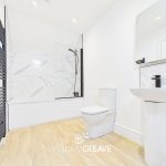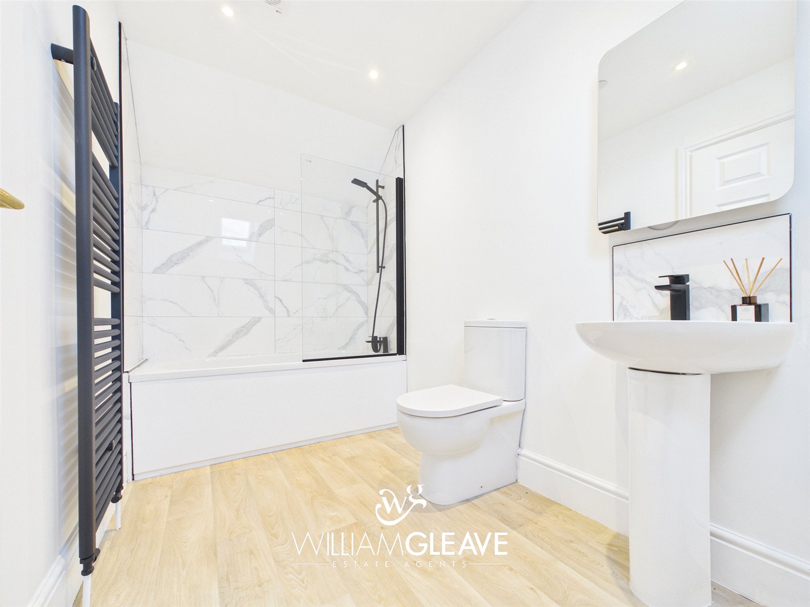 The bathroom is fitted with a low-level WC, a pedestal wash hand basin with mixer tap and tiled splashback, along with a panelled bath featuring a glass shower screen, mixer tap, and a mains-powered wall-mounted shower. The room is finished with LVT flooring, a heated towel rail, and a skylight.
