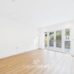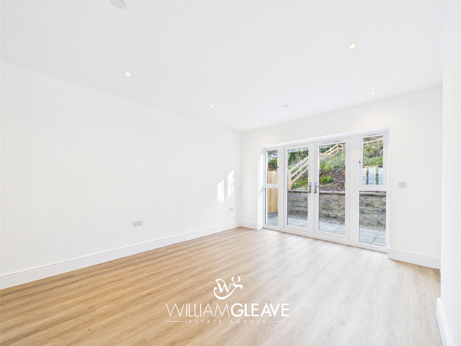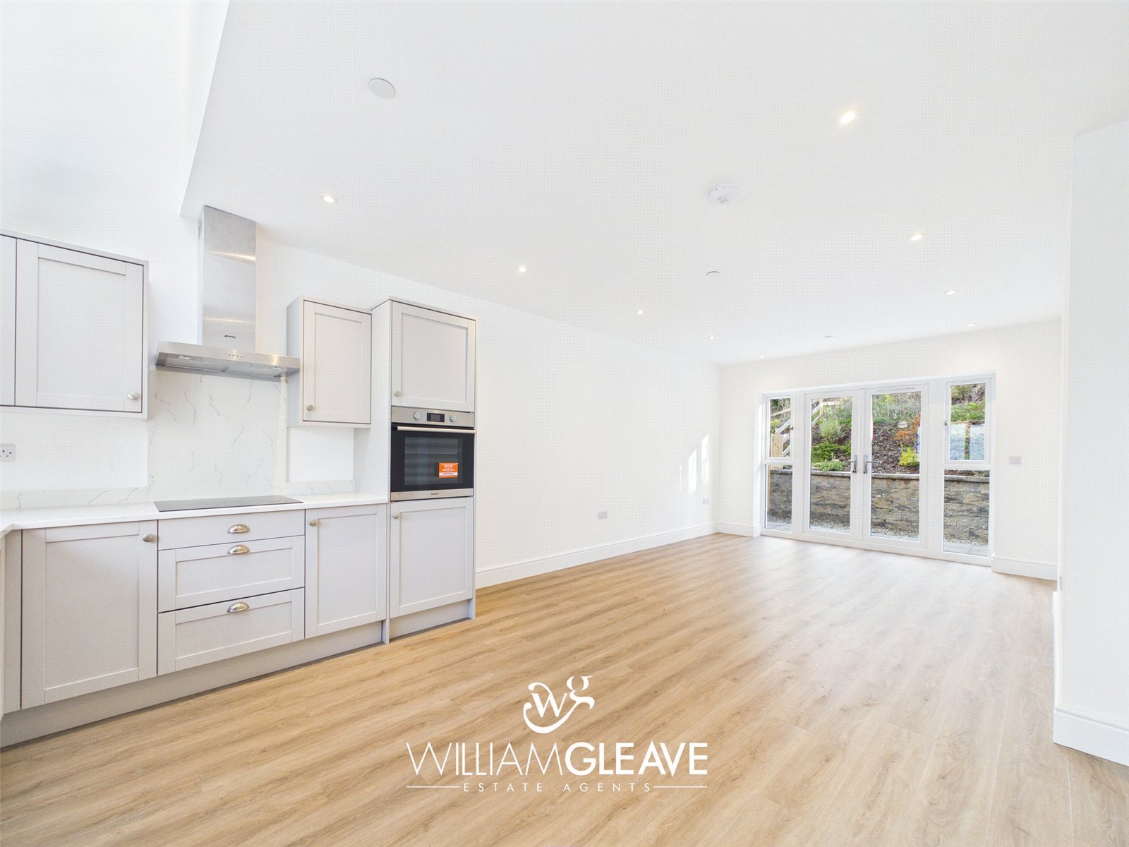 The open-plan living and dining area features triple-glazed patio doors with matching side panels that flood the space with natural light and open directly onto the rear garden. The room is finished with modern laminate flooring and benefits from underfloor heating, multiple power points, and a TV point, creating a comfortable and versatile space ideal for everyday living and entertaining.