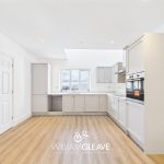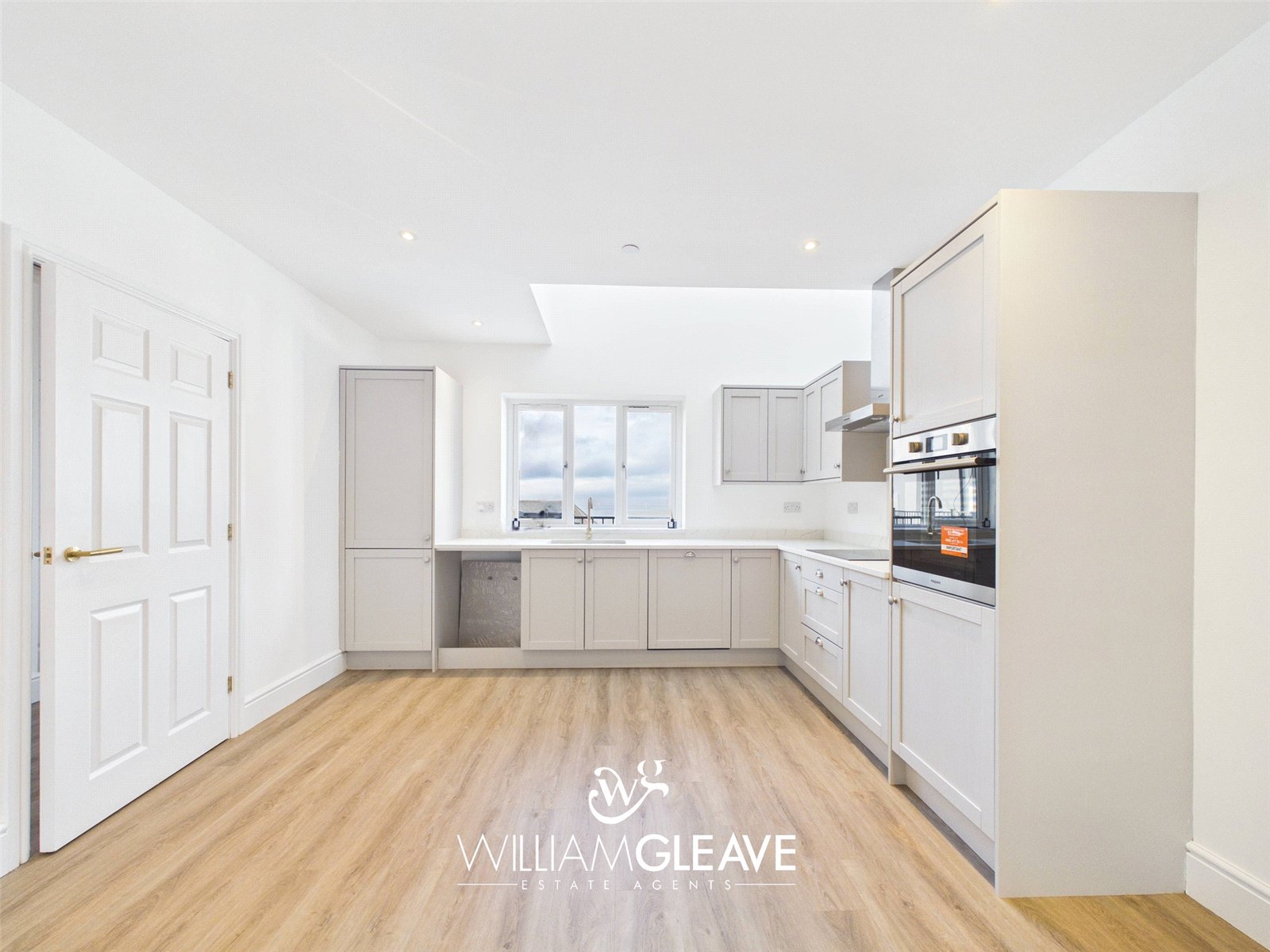 The kitchen area is fitted with a modern range of wall and base units, complemented by a matching quartz worktop. It features an inset one-and-a-half sink with mixer tap and a selection of integrated appliances, including a fridge-freezer, dishwasher, induction hob with stainless steel extractor hood, and an electric oven, with additional space provided for a washing machine. The underfloor heating continues through this space, adding comfort and warmth. A triple-glazed window to the front elevation offers a pleasant sea view, and the room is finished with ample power points for convenience.