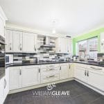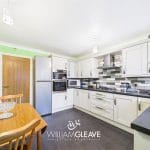 Appointed with a comprehensive range of modern Shaker-style wall and base units, complemented by matching work surfaces incorporating a one-and-a-half bowl stainless-steel sink with drainer and mixer tap. Appliances include a newly installed double eye-level oven, a separate four-ring gas hob, and a stainless-steel extractor hood and space for a fridge/freezer. The room features part-tiled walls, tiled flooring, and a wall-mounted combi boiler. A double-glazed window to the rear elevation provides natural light, with a double-glazed door offering access to the garden. Additional features include a radiator and power points.