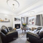 A larger-than-average and highly versatile reception space, featuring coved ceilings and a contemporary inset electric fire with living-flame effect. The room is equipped with TV and power points, along with a radiator. A door provides access to the utility room, while double-glazed French doors with matching glazed side panels open into the sunroom, enhancing the flow of natural light.