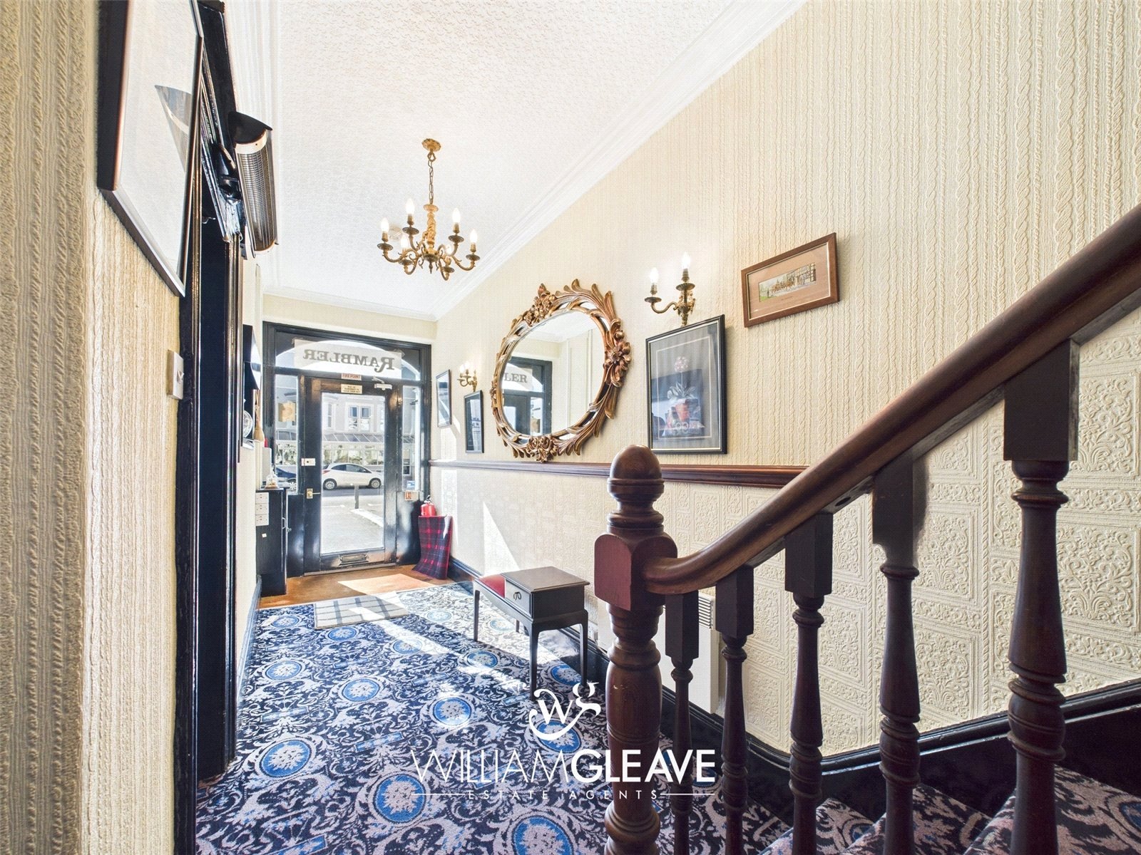 Stairs lead up to first floor landing with carpet and doors leading off.