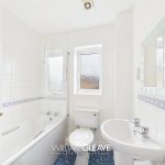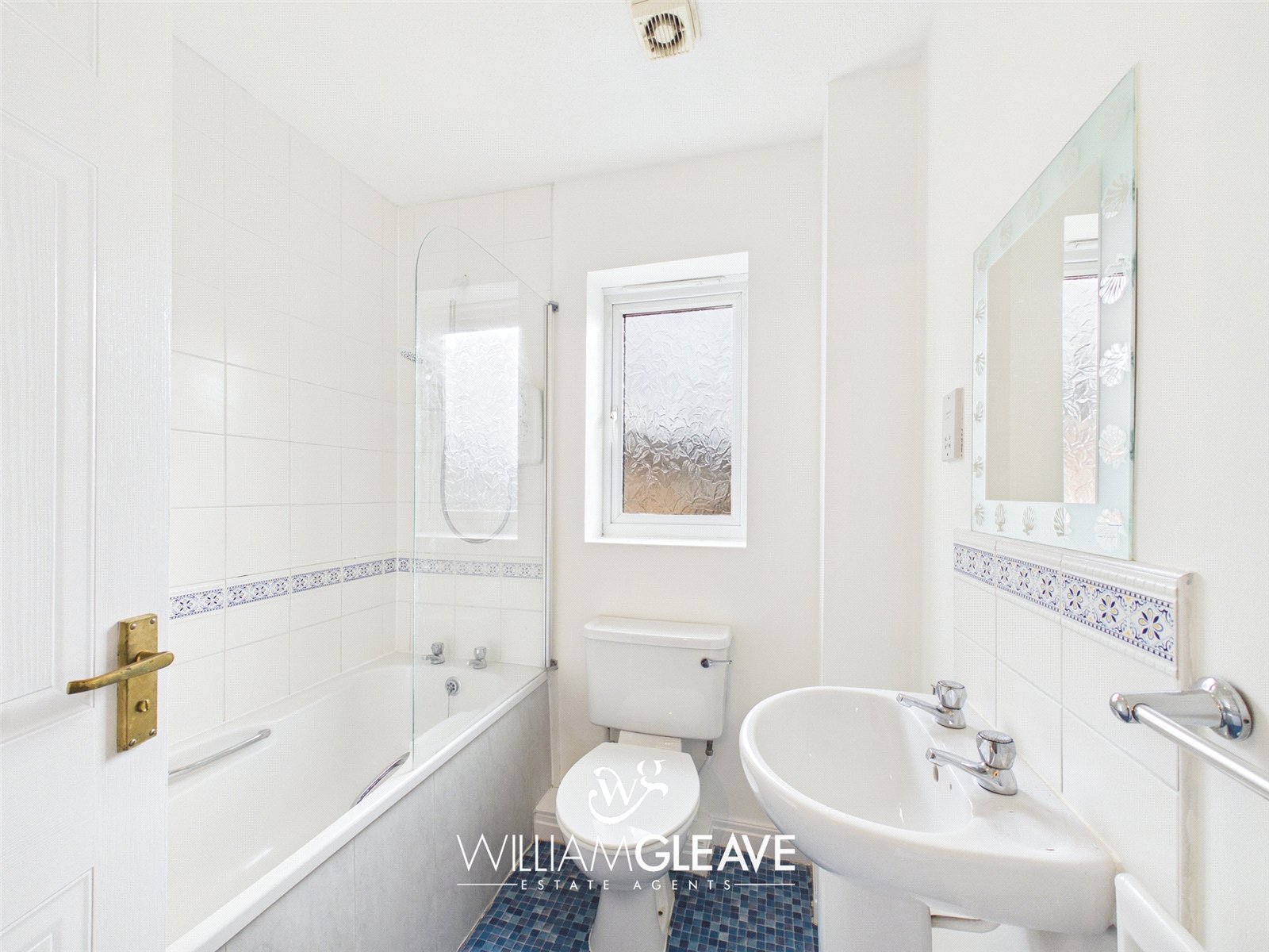 The bathroom is fitted with a three-piece suite comprising a panel-enclosed bath, low-flush WC and hand wash basin with tiled splashback. The room features partly tiled walls, a radiator, shaving point and a frosted window to the side elevation allowing for natural light while maintaining privacy.