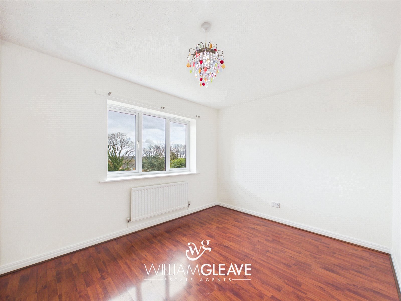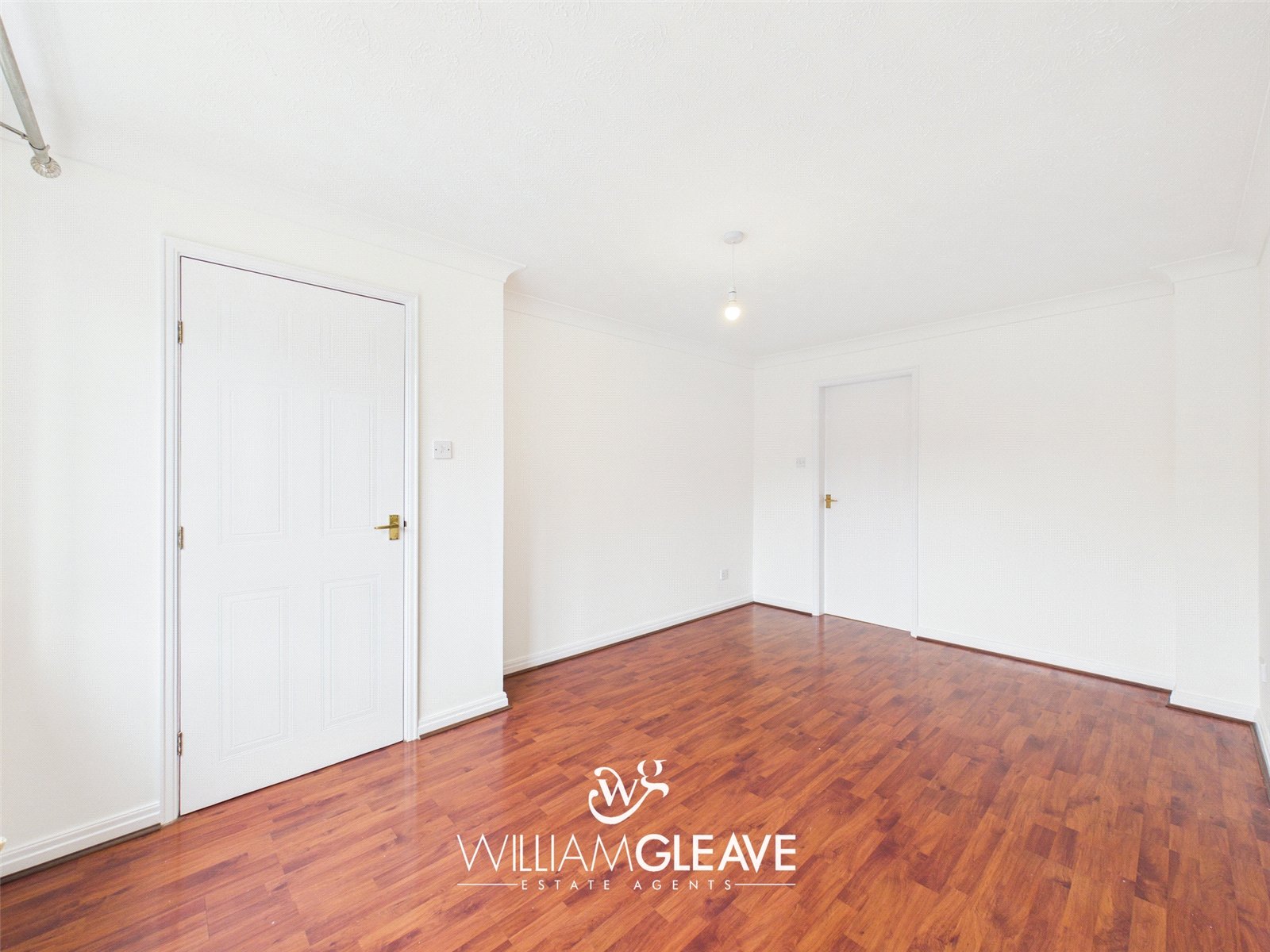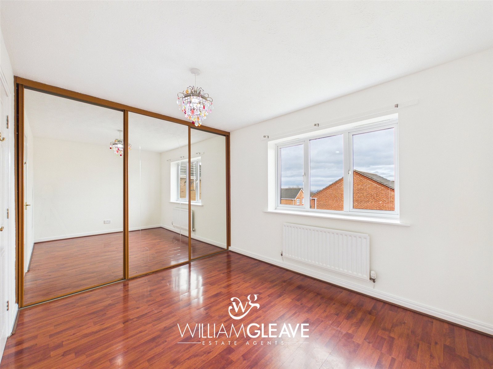 A well-proportioned double bedroom featuring fitted sliding wardrobes, wood-effect flooring, a radiator and multiple power points. A window to the rear elevation provides pleasant views overlooking the garden.