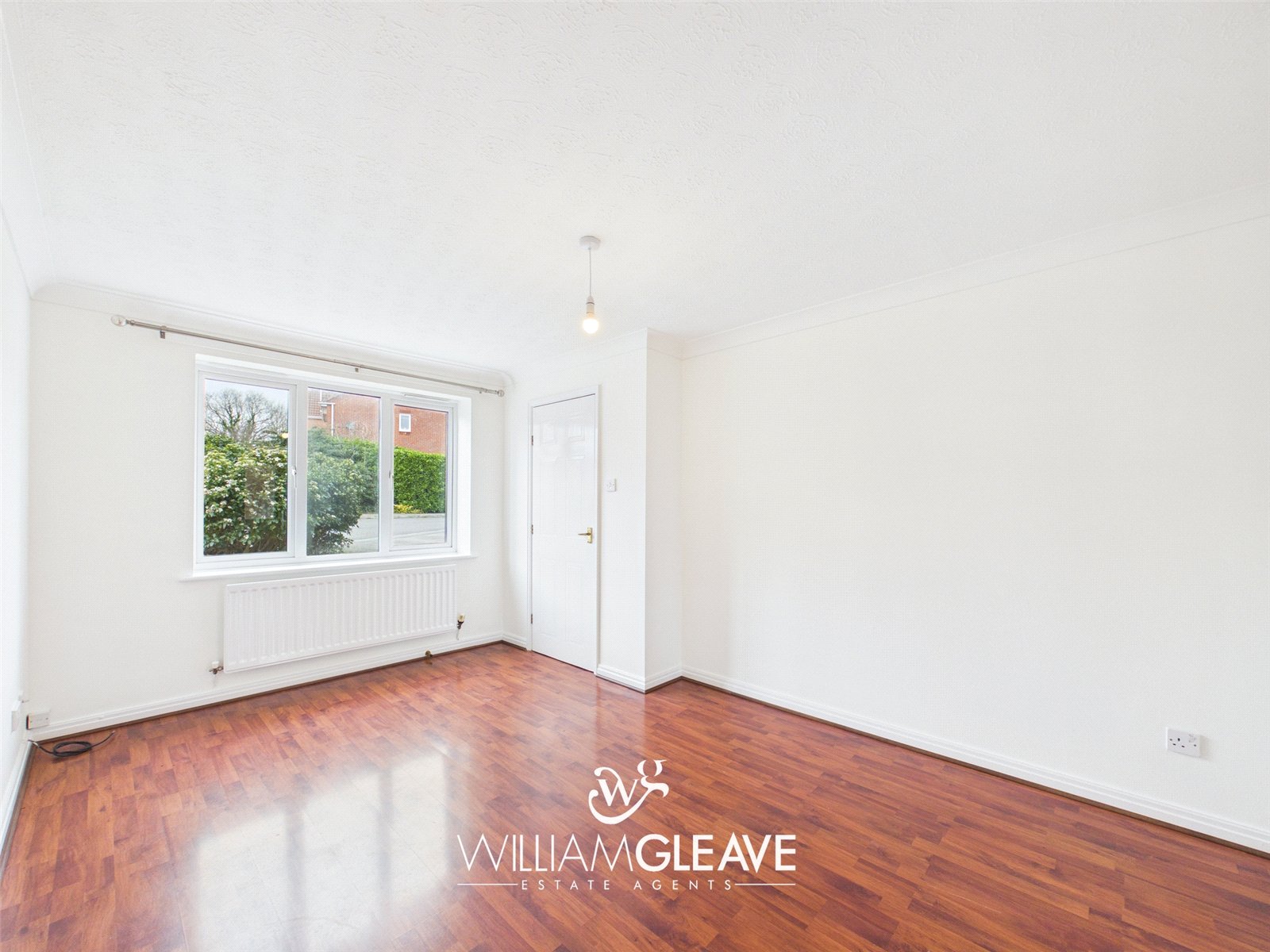 An inviting lounge featuring a window to the front elevation, allowing for plenty of natural light. The room is fitted with wood-effect flooring, a radiator, and multiple power points, with a door leading through to the kitchen/diner.