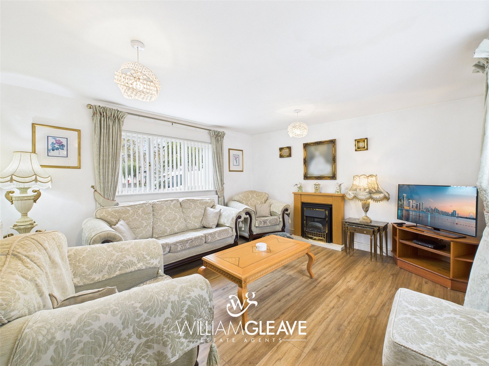 Step down into a cosy and inviting living room featuring attractive wood-effect laminate flooring and multiple power sockets throughout. A wall-mounted double-panel radiator sits beneath a uPVC double-glazed window to the front elevation, while another window to the rear allows light to flood the room from both aspects. Two ceiling light fittings add warmth and ambience, and an electric fireplace serves as a lovely focal point.