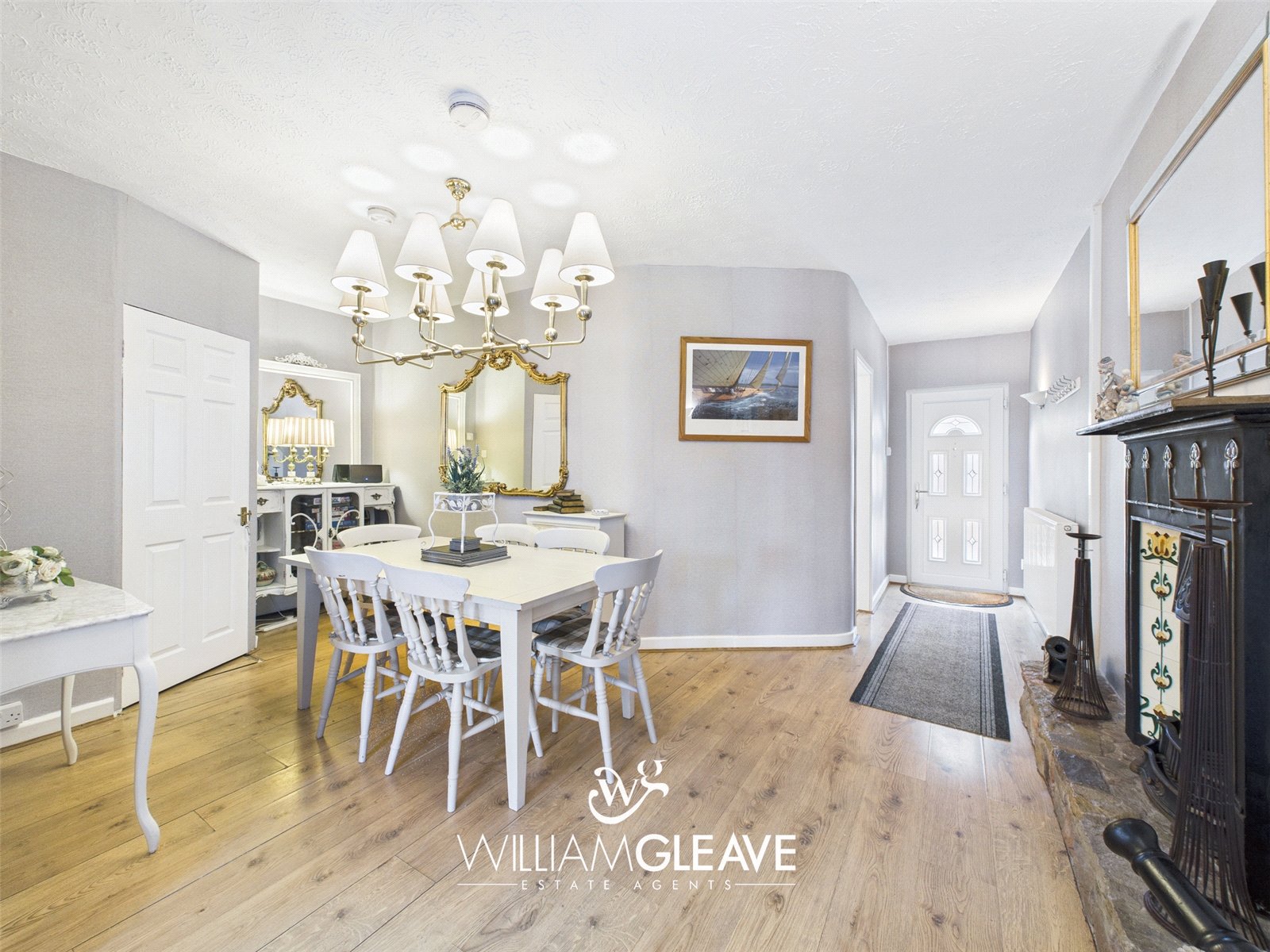 Accessed via a uPVC front door with decorative frosted double-glazed panels, the welcoming entrance hall features elegant wallpapered walls, laminate flooring, and both ceiling and wall lighting. There is a wall-mounted double panel radiator, power sockets, and access to the adjoining holiday let via a connecting door. Double wooden doors with frosted glazed panels open into the main lounge/diner.