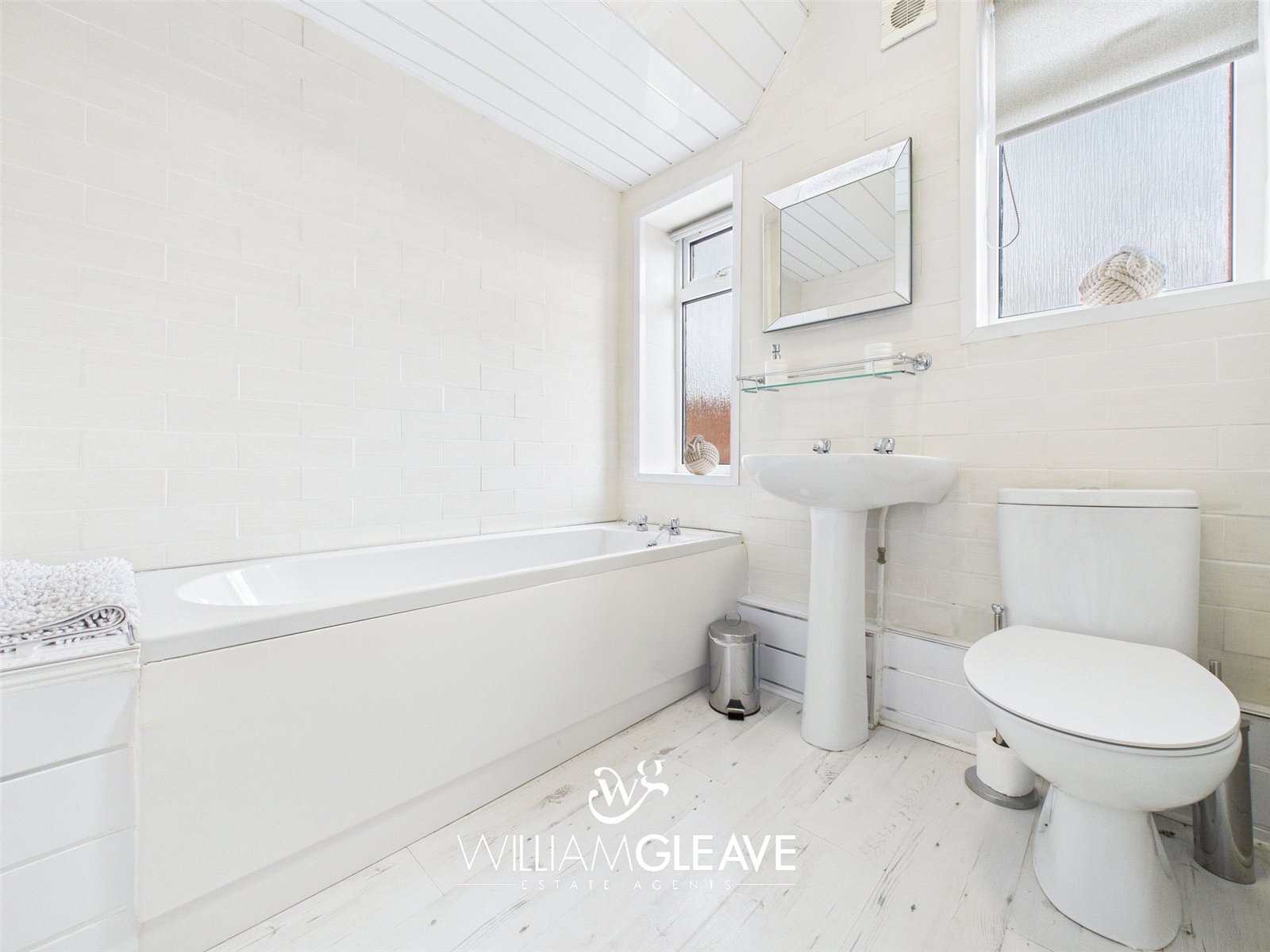 Step down into a bright and airy bathroom finished with elegant tiled walls throughout. The space includes a wall-mounted heated towel rail, low-flush WC, wash basin with hot and cold taps, and a bath with matching hot and cold fittings. The ceiling features a loft hatch and central light fitting, along with an extractor fan. Two UPVC double-glazed frosted windows with top openers provide natural light and privacy to the rear elevation.