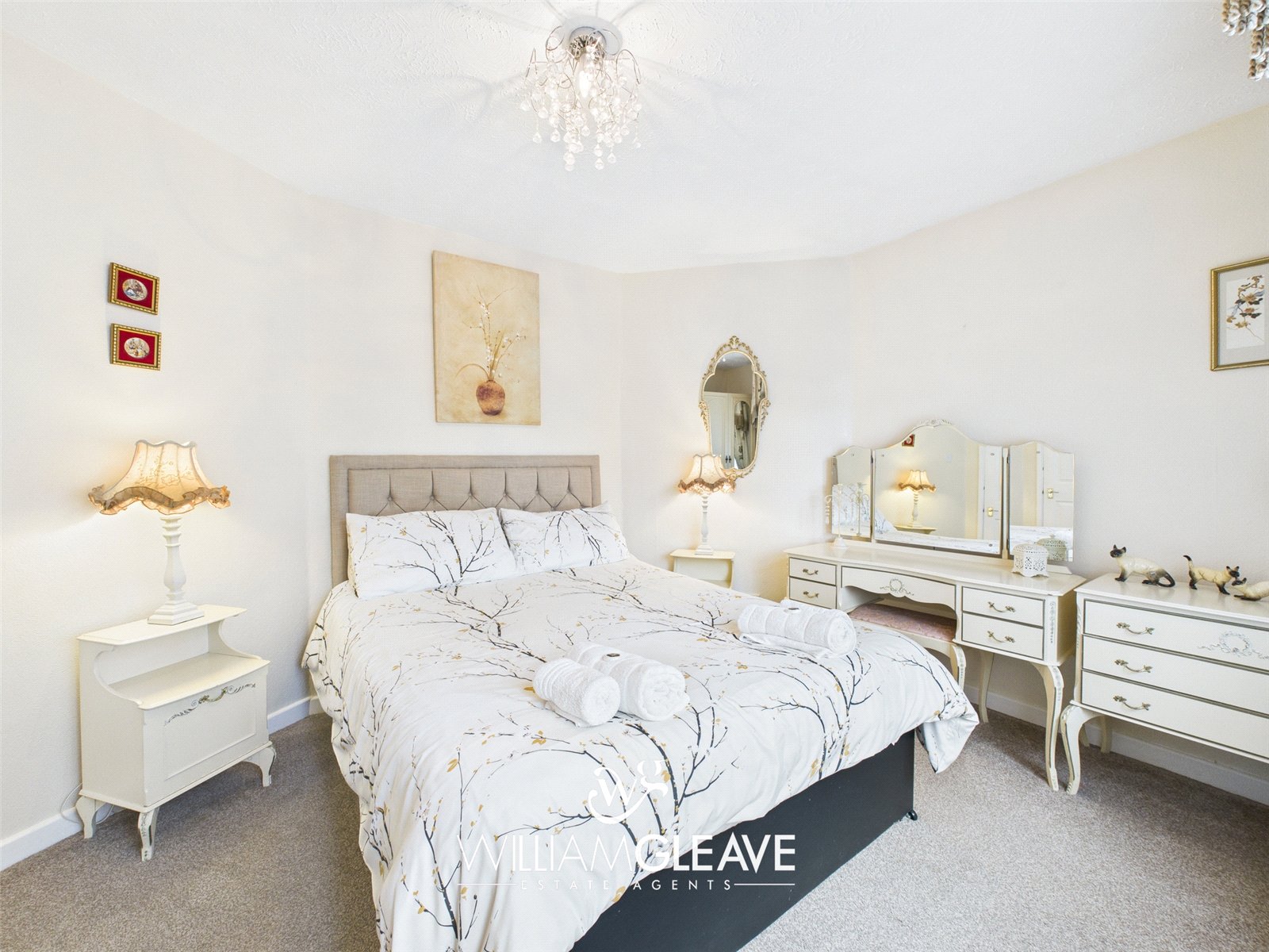 An elegant double bedroom with soft carpet flooring and neutrally painted walls, enhanced by a vibrant feature wallpaper. Power sockets and a central ceiling light are provided. The room’s shape allows for ample bedroom furniture and wardrobe space. A uPVC double-glazed window to the front elevation overlooks the driveway, with a wall-mounted double-panel radiator below.