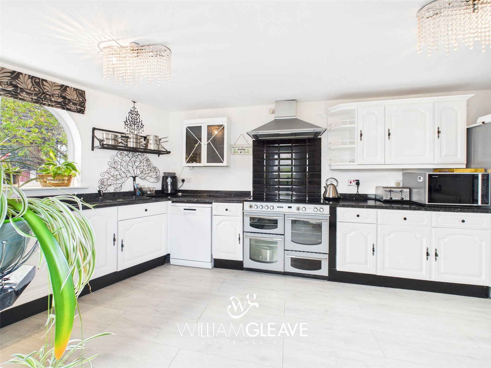 A generous and well-designed kitchen fitted with a range of wall, base and glazed units, complemented by attractive worktops and modern wood-effect flooring. There is space for a dishwasher, washing machine, electric oven (with tiled splashback and extractor), and fridge-freezer. The kitchen also includes a double sink with mixer tap set beneath an arch-shaped decorative window. A uPVC back door provides direct access to the rear garden.