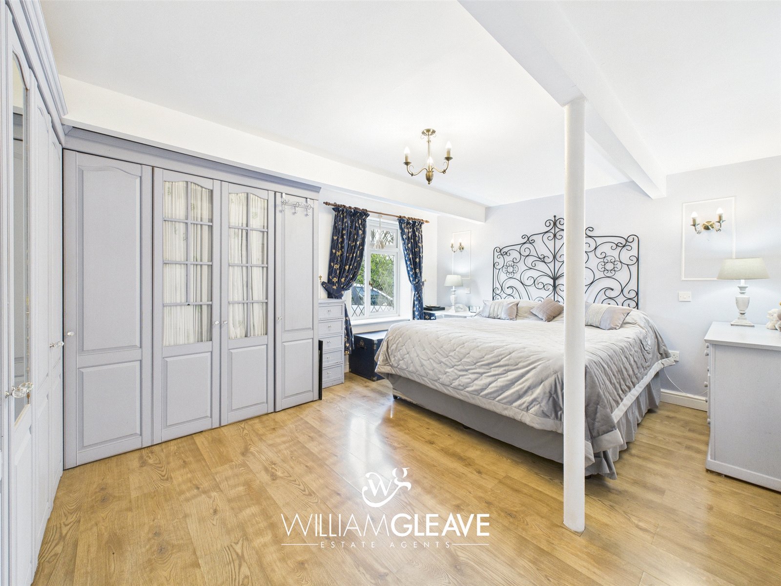Accessed through wooden doors with frosted glazed panels, a low step down leads into a spacious and well-equipped kitchen. Modern wood-effect flooring runs throughout, complementing a generous range of wall and base units with matching worktops.