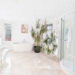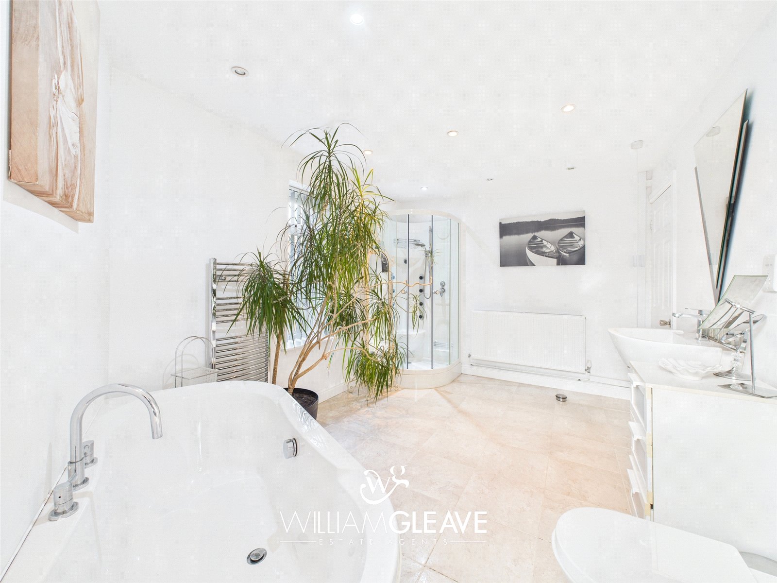 A beautifully presented and contemporary four-piece suite comprising a low-flush WC, floating wash basin with mixer tap, a large bath with swan-neck mixer tap, and a corner shower unit with handheld attachment, body jets, shower seat, and curved glazed screens. The bathroom is finished with elegant tiled flooring, recessed ceiling spotlights, a heated towel rail, wall-mounted radiator, electric shaver point, and two frosted uPVC double-glazed windows to the front and side elevations.