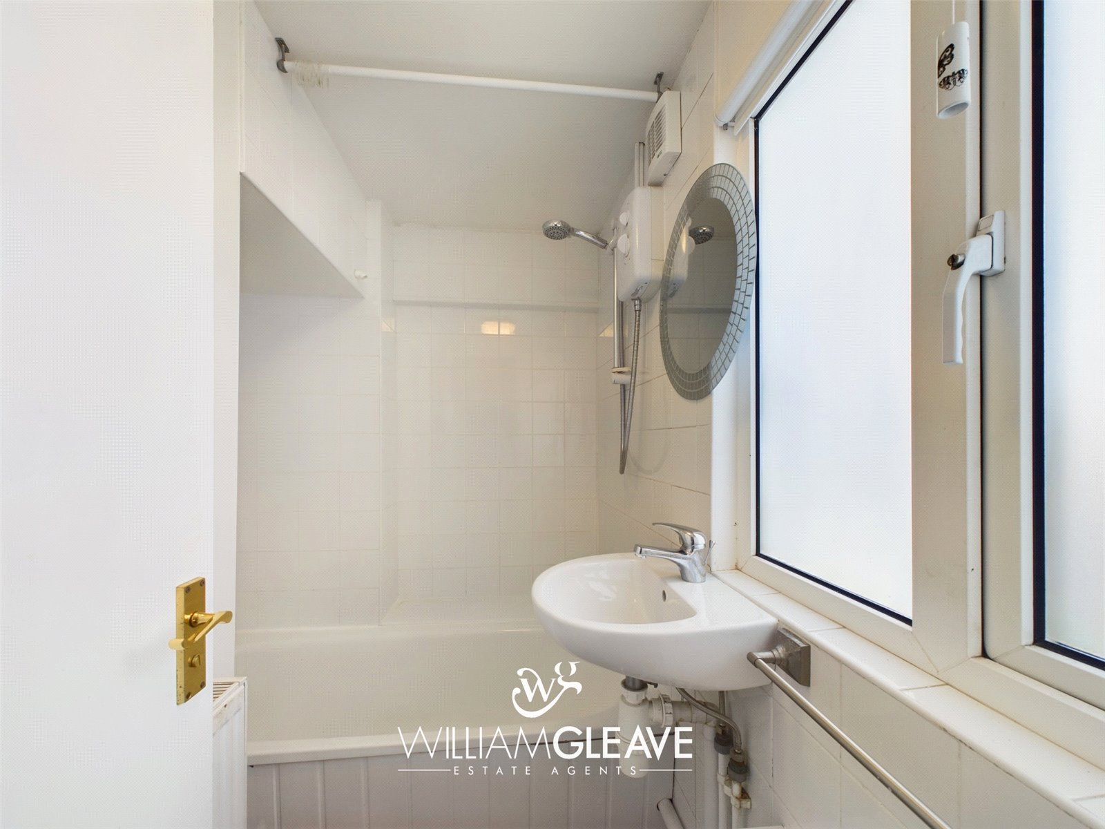 With a two piece suite comprising panelled bath with shower over and wash hand basin. Tiled walls and double glazed window to the rear.