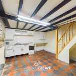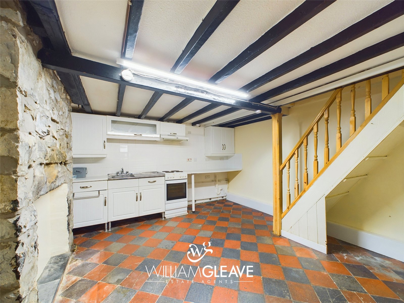With a range of fitted wall and base cupboards with worktop surfaces over, inset stainless steel single drainer sink, space for gas cooker, Quarry tiled floor, feature exposed stone chimney breast, cupboard housing consumer unit, power points and door into;