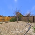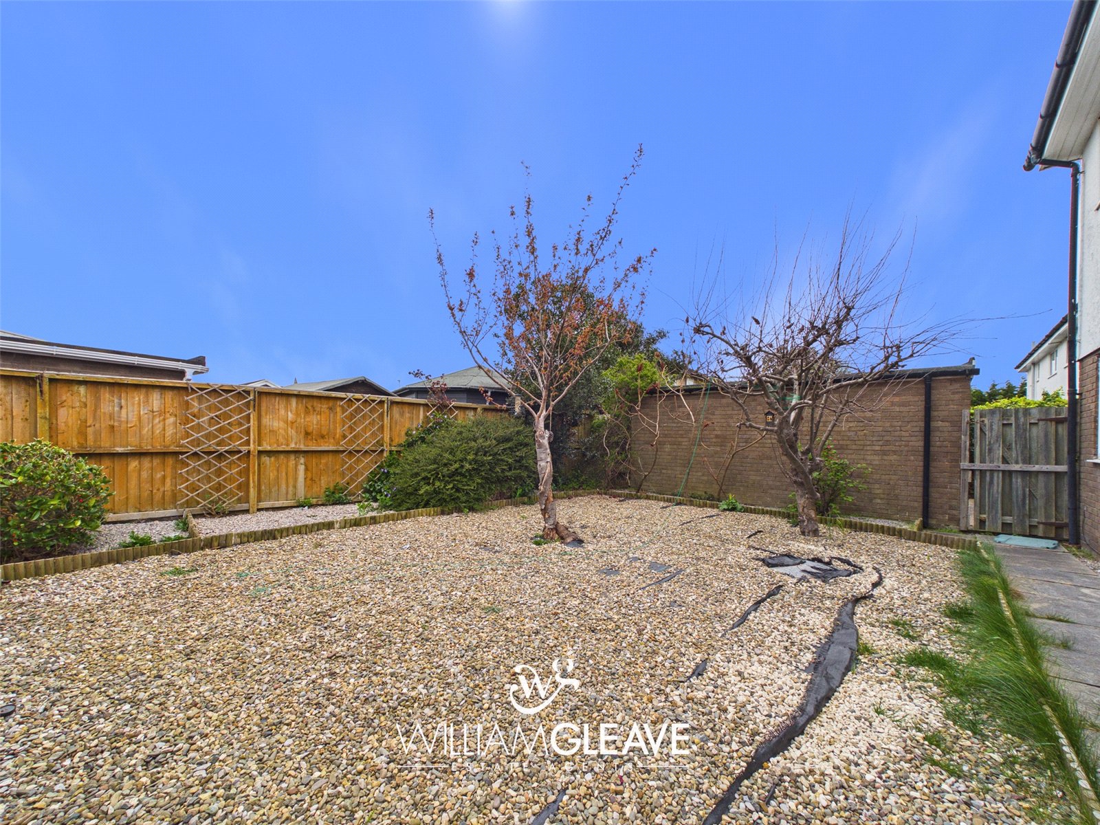 Externally, the property benefits from a driveway providing off-road parking and access to a single garage. To the rear, there is a low-maintenance yard enclosed by wood-panel fencing. The space features areas of golden gravel along with a selection of mature shrubs and trees, creating a pleasant outdoor setting.