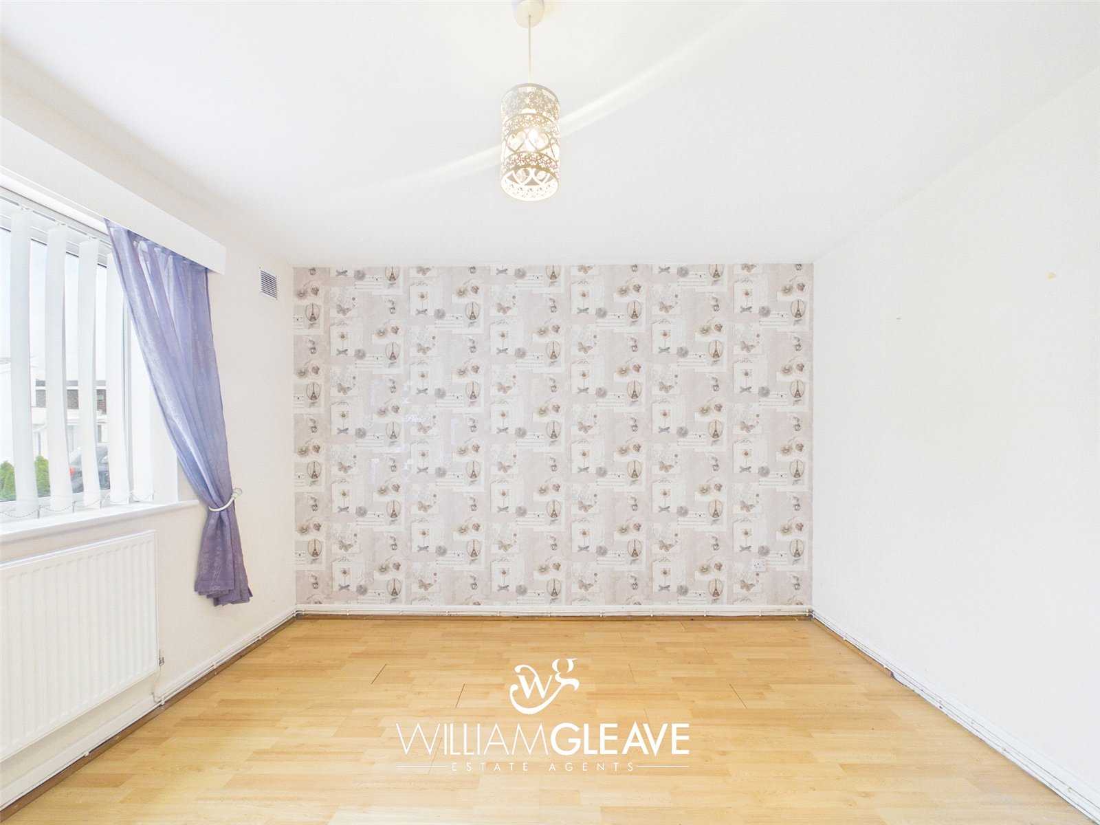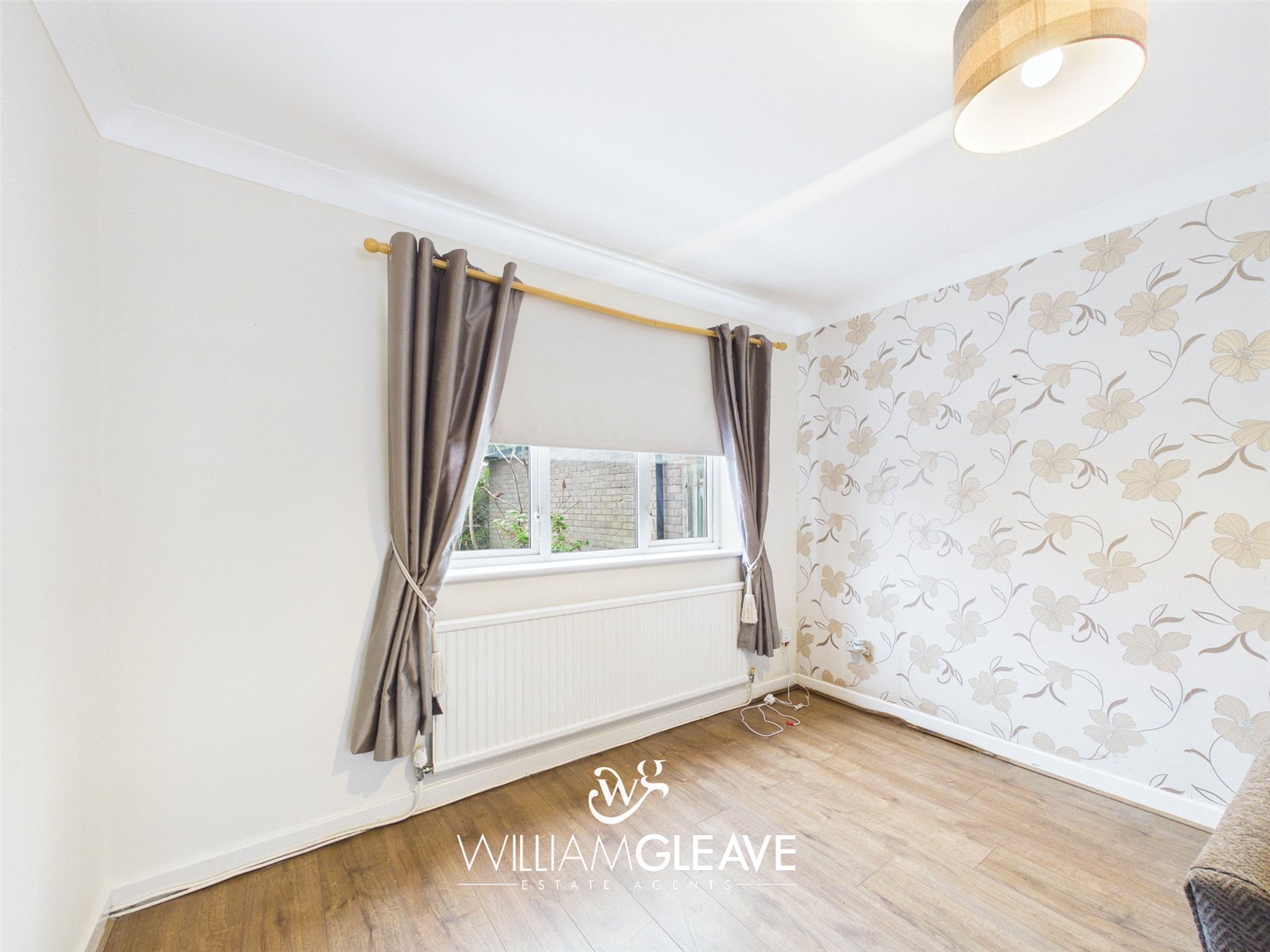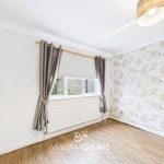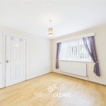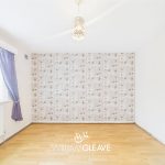 The bedroom is a well-proportioned double room located at the front of the property. It features a double-glazed window, wood flooring, and a built-in storage cupboard. There is ample space for a double bed along with additional bedroom furniture.