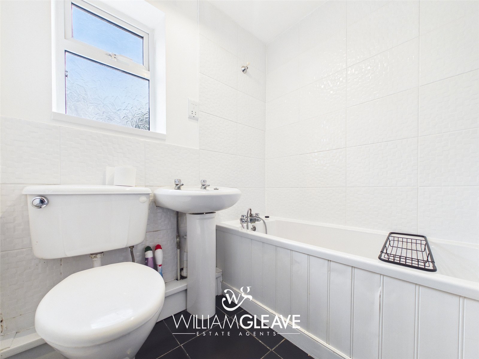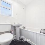 The bathroom features a low-level WC, a pedestal wash hand basin, and a panelled bath with a shower attachment. The walls are partially tiled, and the room includes tiled flooring and a heated chrome towel rail. A frosted window on the rear elevation provides natural light while maintaining privacy.