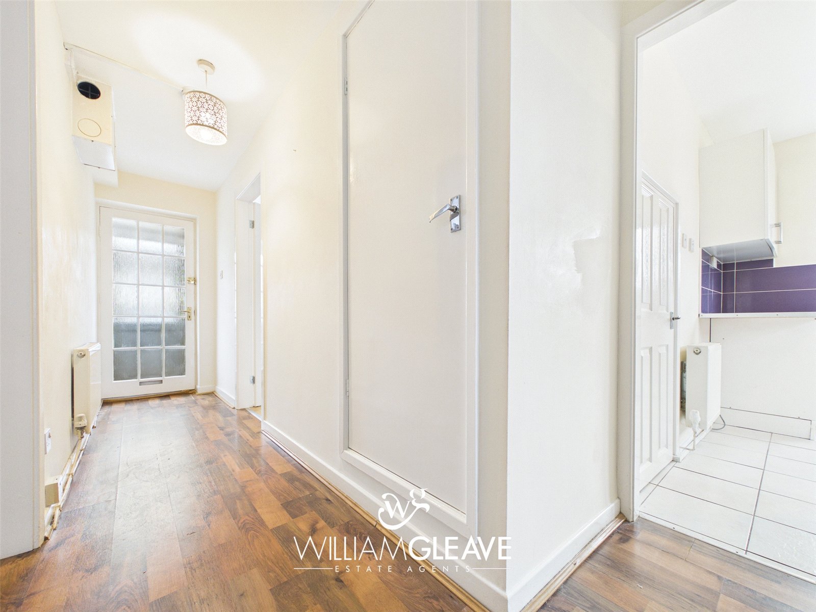 As you step through the PVC door into the porch, a wooden internal door leads you into the hallway. From here, you can access the main living areas, the bedroom, and the bathroom. The hallway also includes a storage cupboard and a radiator.