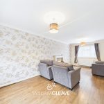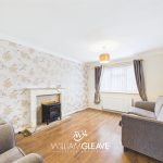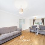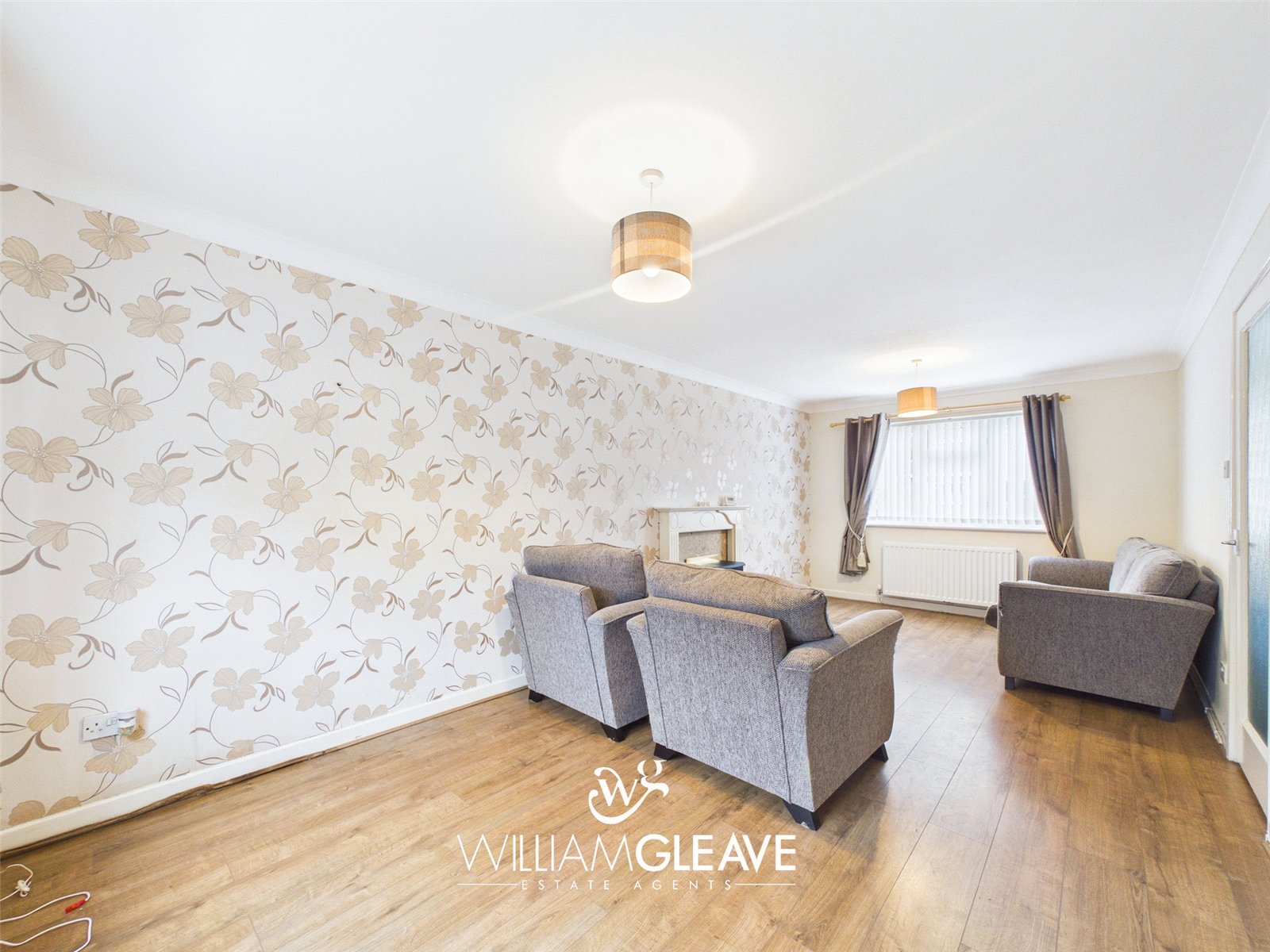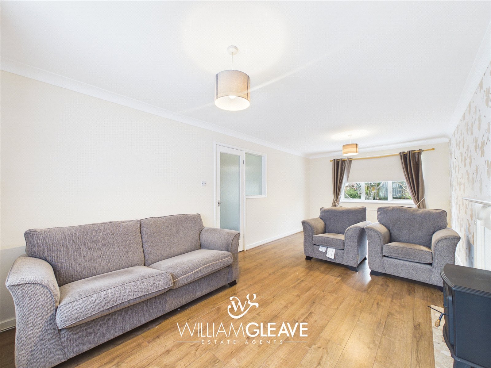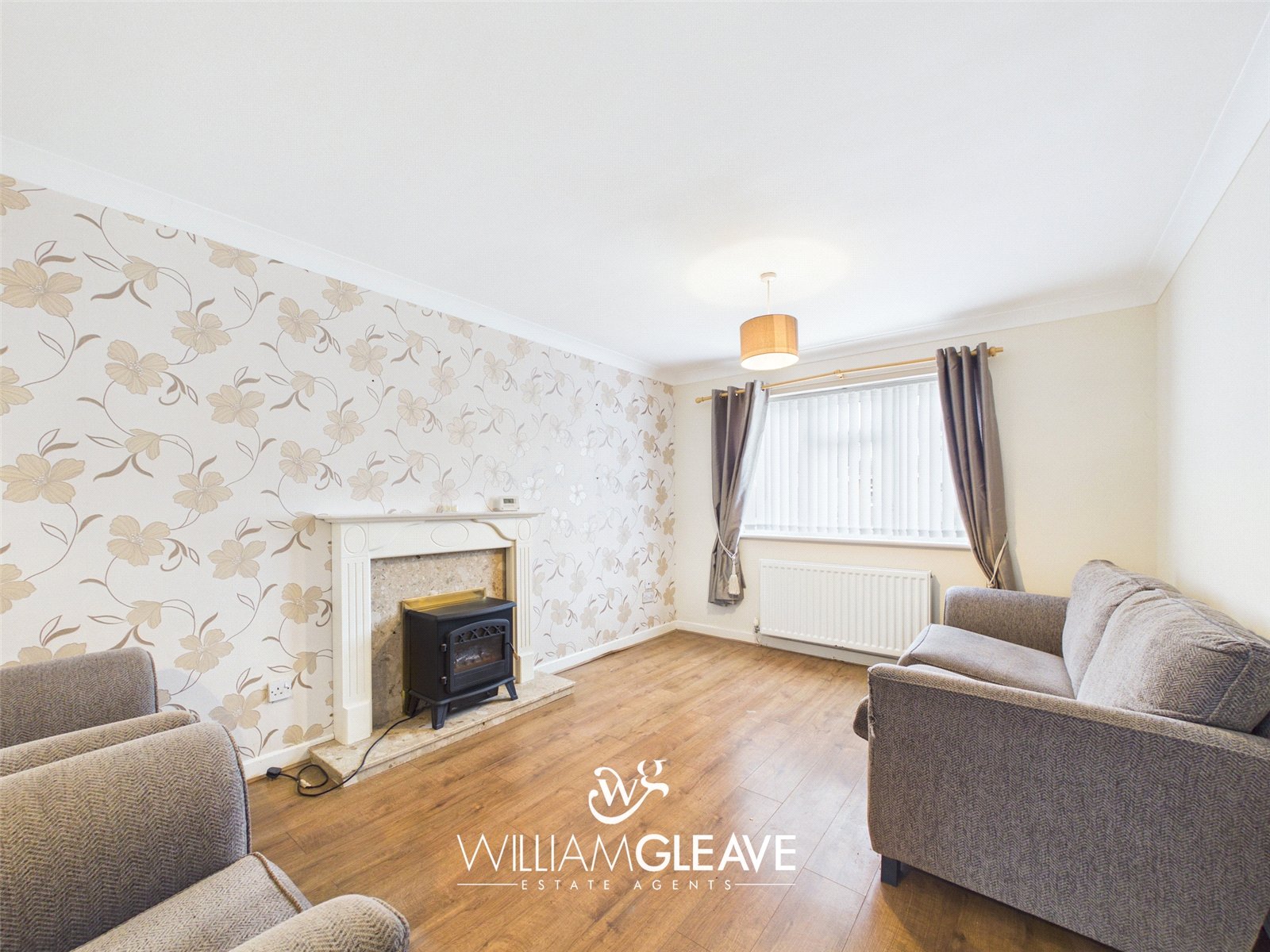 The living/dining room has dual-aspect windows, creating a bright and inviting space. It features an electric feature fireplace, wood-effect flooring, and ample room for sofas as well as a generously sized dining table.