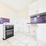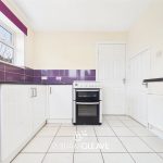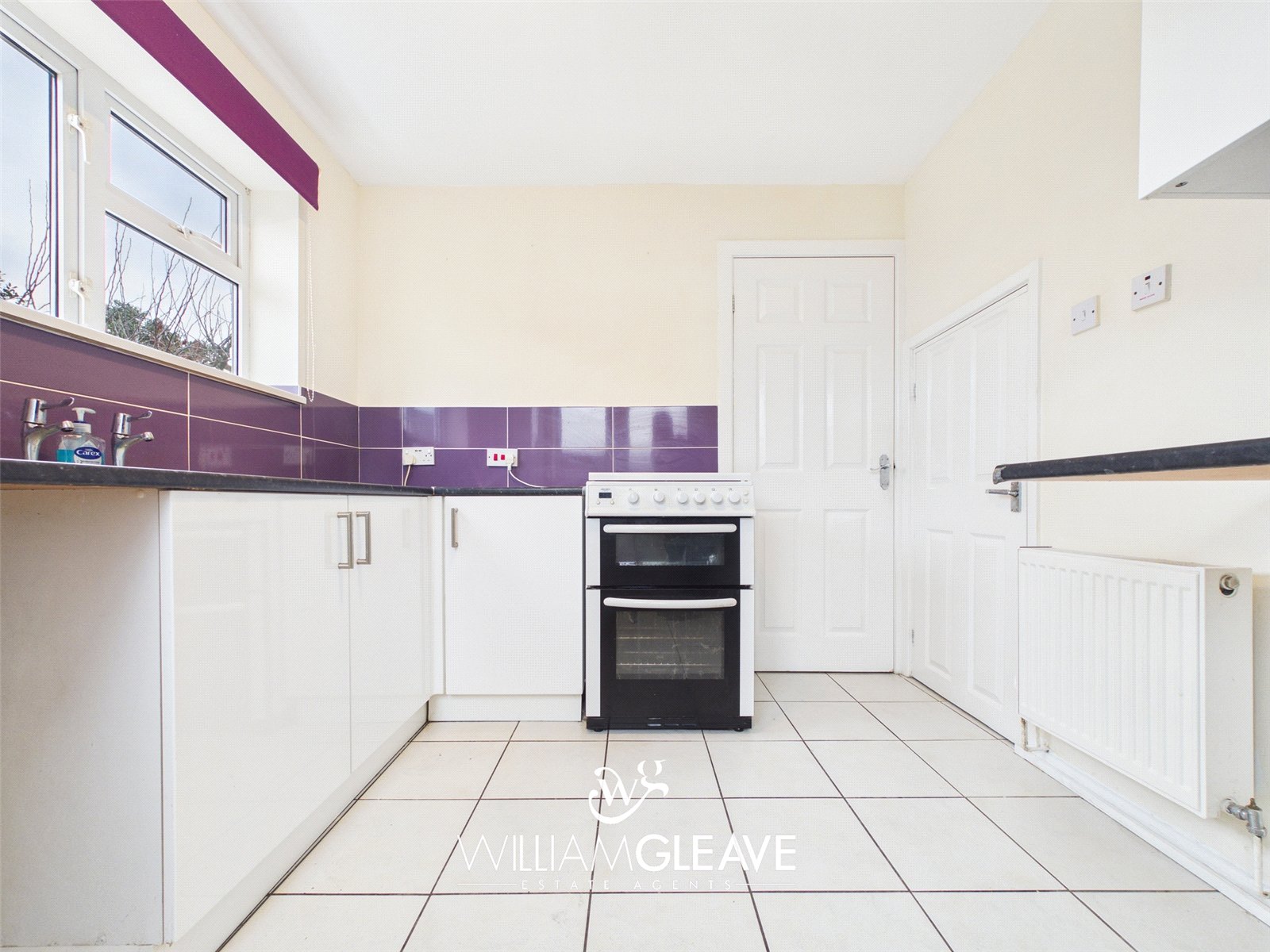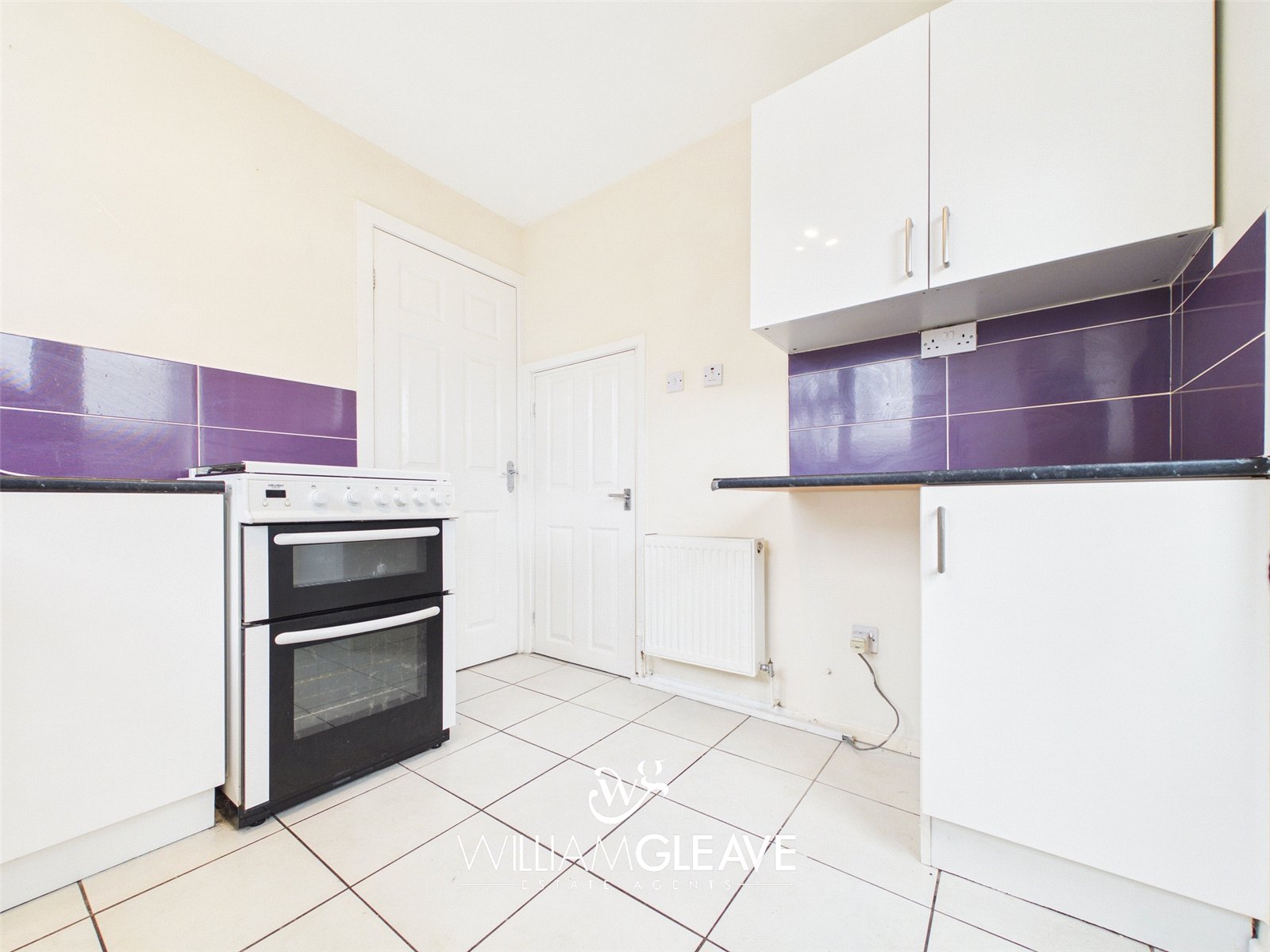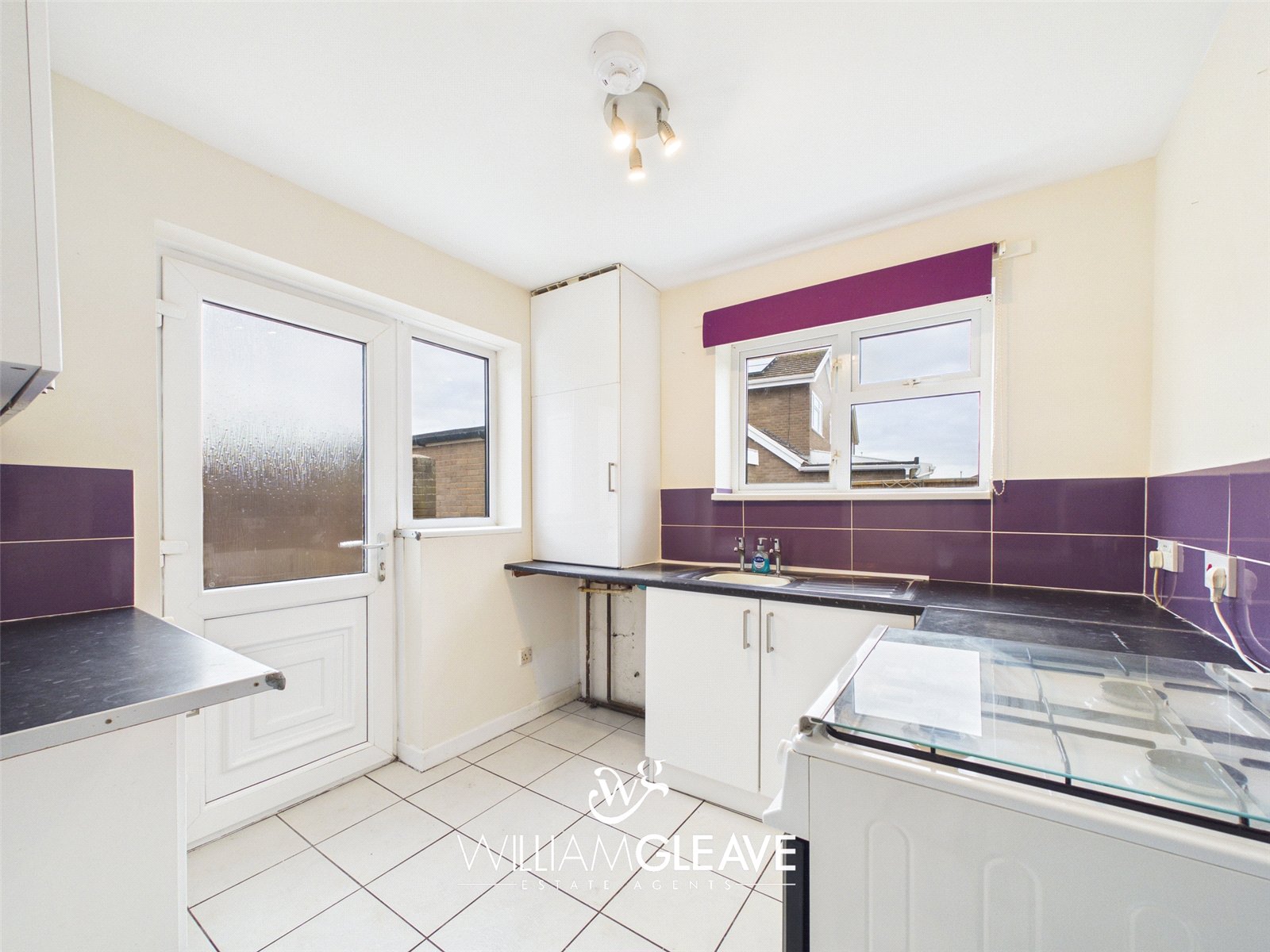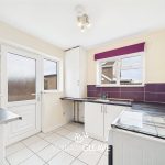 The kitchen is fitted with a range of wall and base units with complementary work surfaces over. The walls are partially tiled, and the room benefits from two windows and a frosted door leading out to the rear garden. Additional features include tiled flooring and a useful storage cupboard. There is also under-counter space for a fridge freezer, as well as designated space for an oven and a washing machine.