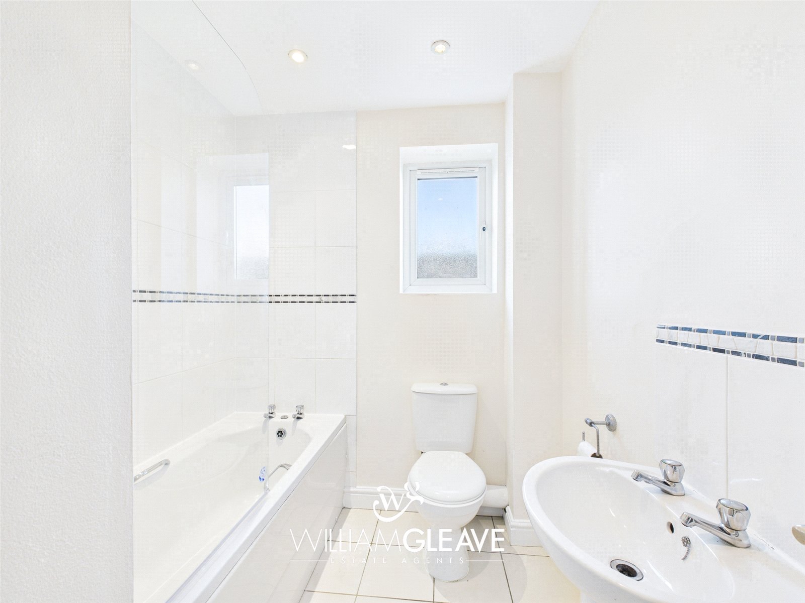 The bathroom is a clean, neutral space, featuring a white bath with a stainless steel shower unit, a white WC, and a white basin with stainless steel taps. A double-glazed frosted window to the rear elevation provides natural light while maintaining privacy.
