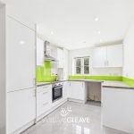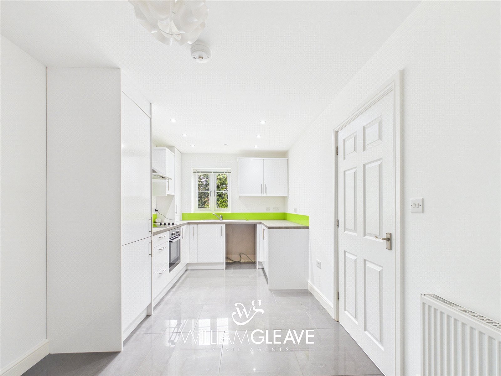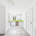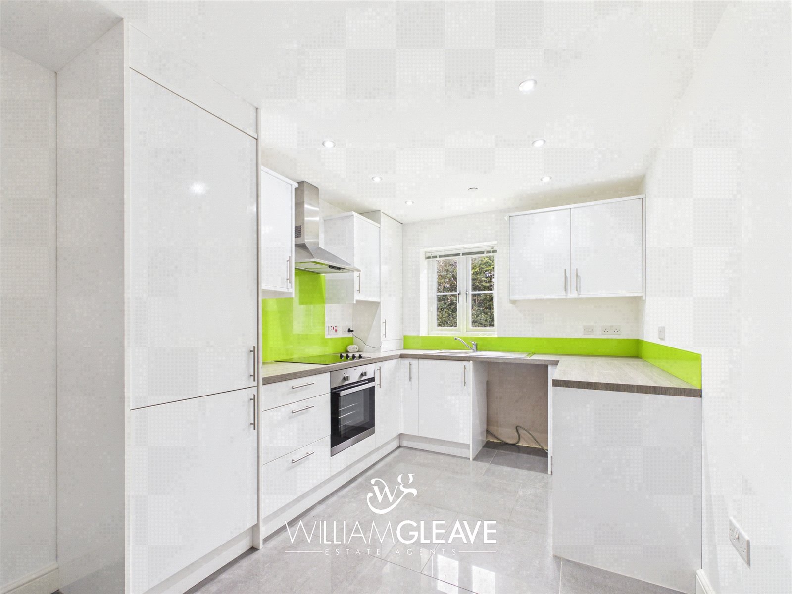 Fitted with a range of white gloss wall and base units with complementary worktop surfaces over, incorporating a stainless steel sink with drainer and mixer tap. Integrated oven with four-ring electric hob and stainless steel extractor hood above, with Glass splashback. Space for a fridge/freezer and plumbing for a washing machine.