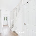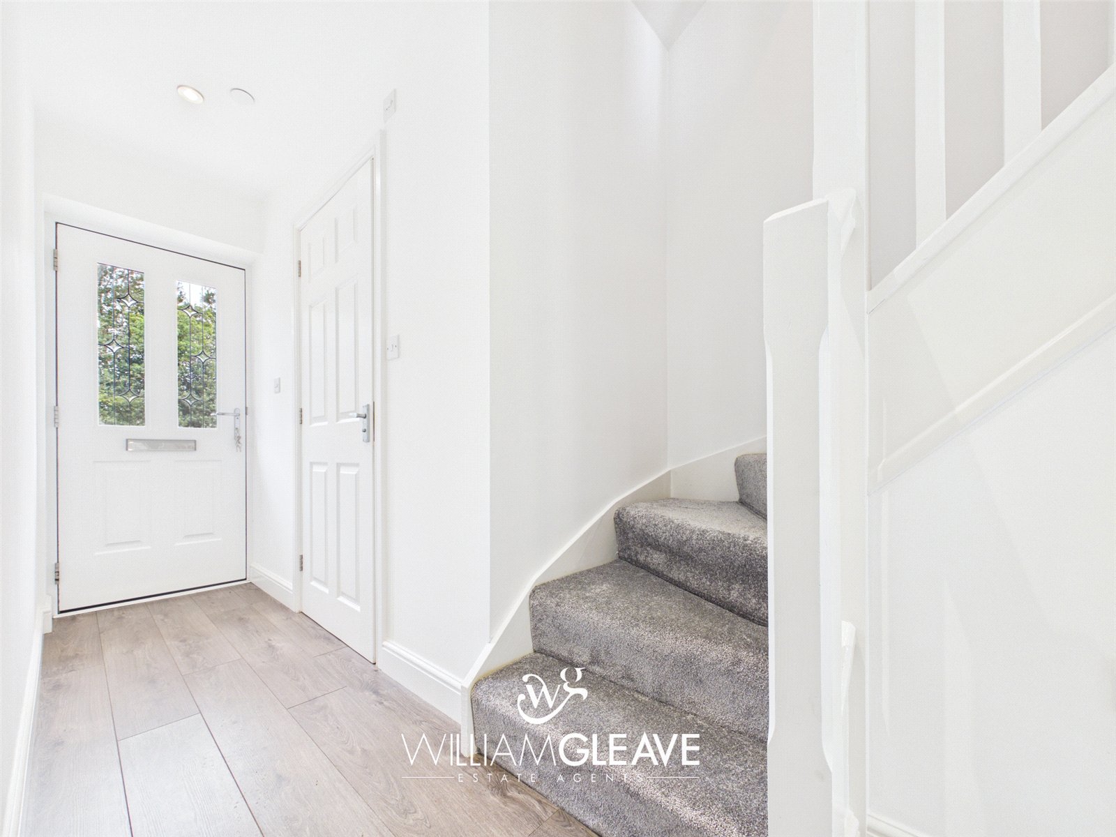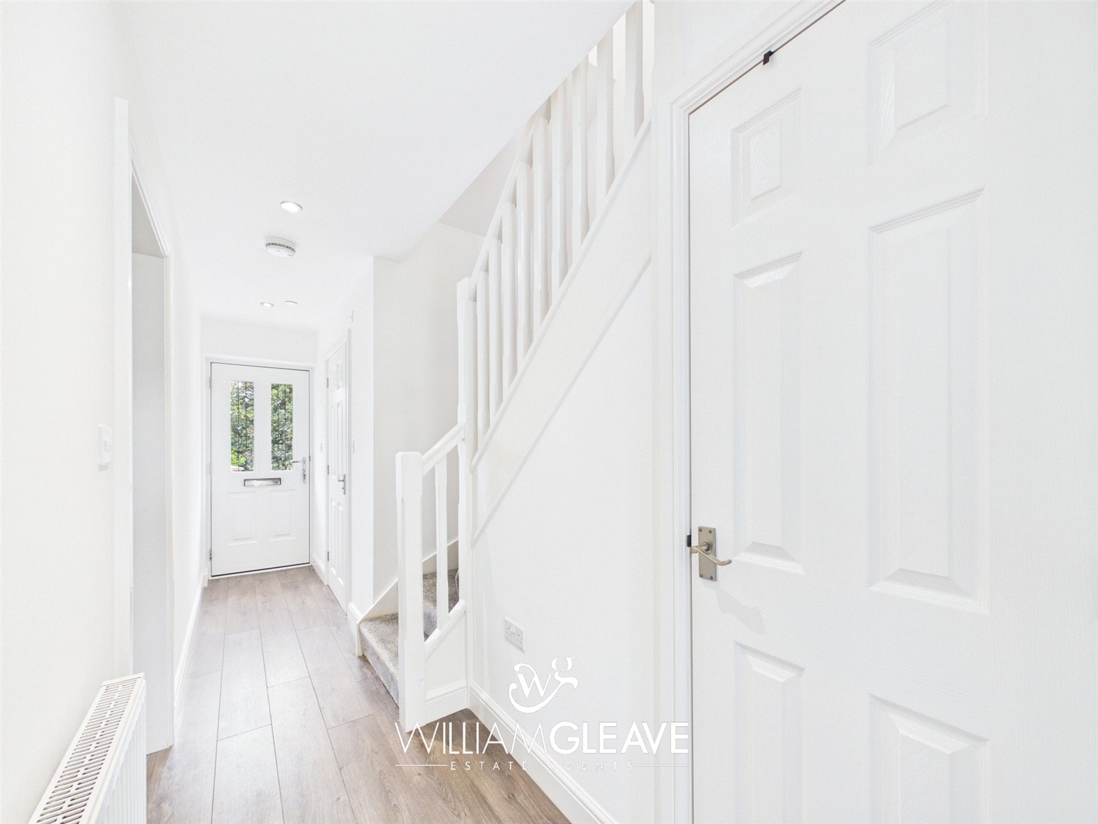 Double glazed entrance door leading into the hallway, with wood-effect laminate flooring, radiator, and power points. Under-stairs storage cupboard, staircase rising to the first floor, and doors leading to all ground floor rooms.