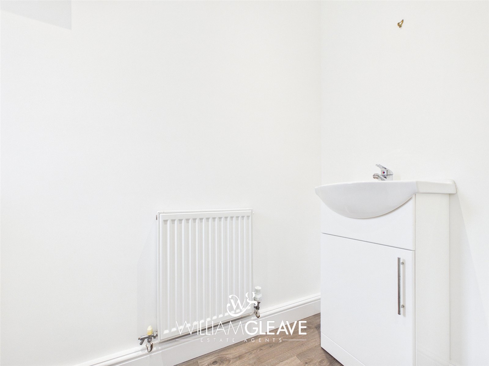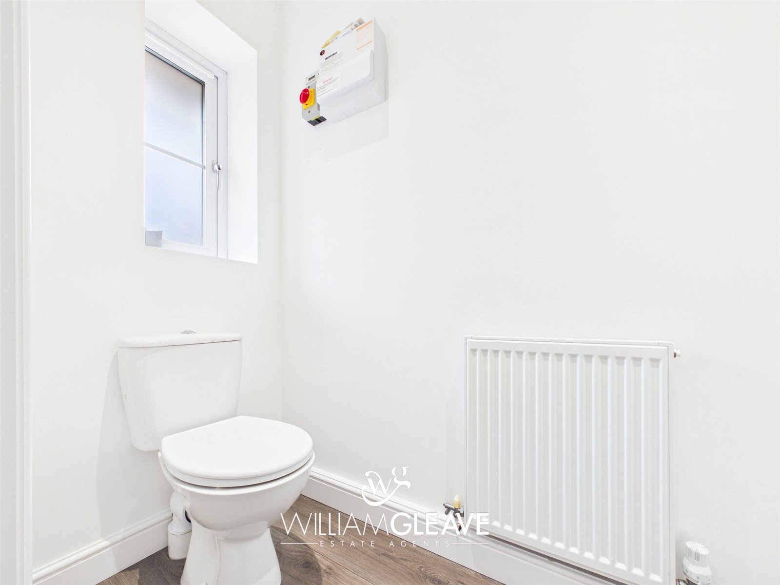 Fitted with a two-piece white suite comprising a low-level WC and a white gloss vanity unit incorporating a wash hand basin with stainless steel mixer tap. Features include a radiator, double glazed frosted window, wood-effect laminate flooring, and inset spotlights.