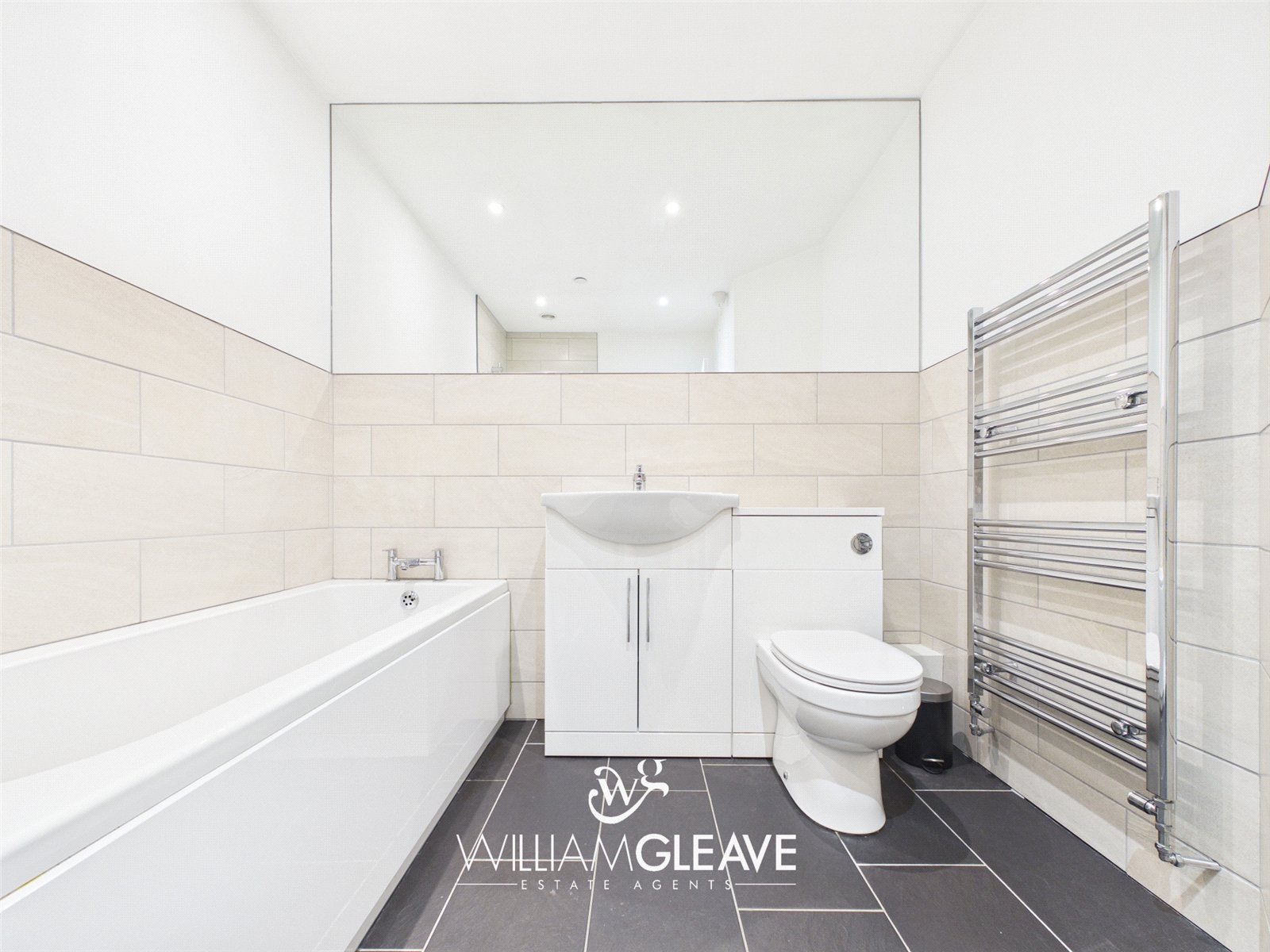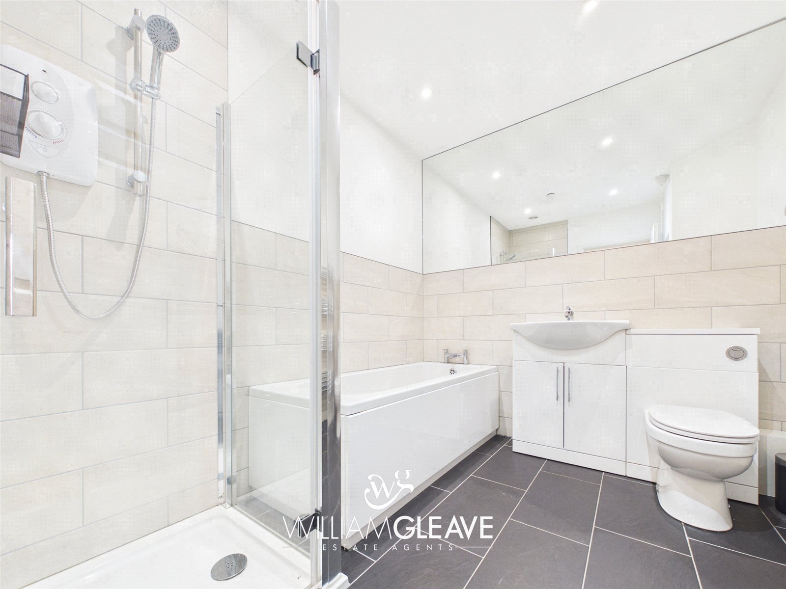 A stylish four-piece white suite comprising a panelled bath with stainless steel mixer taps, and a separate shower cubicle fitted with a wall-mounted Mira shower and handheld attachment. Also includes a vanity unit with white gloss finish incorporating an inset wash hand basin with stainless steel mixer tap, and a low-level WC. Finished with tiled flooring, part-tiled walls, full-width wall mirror, heated chrome towel rail, and inset spotlights.